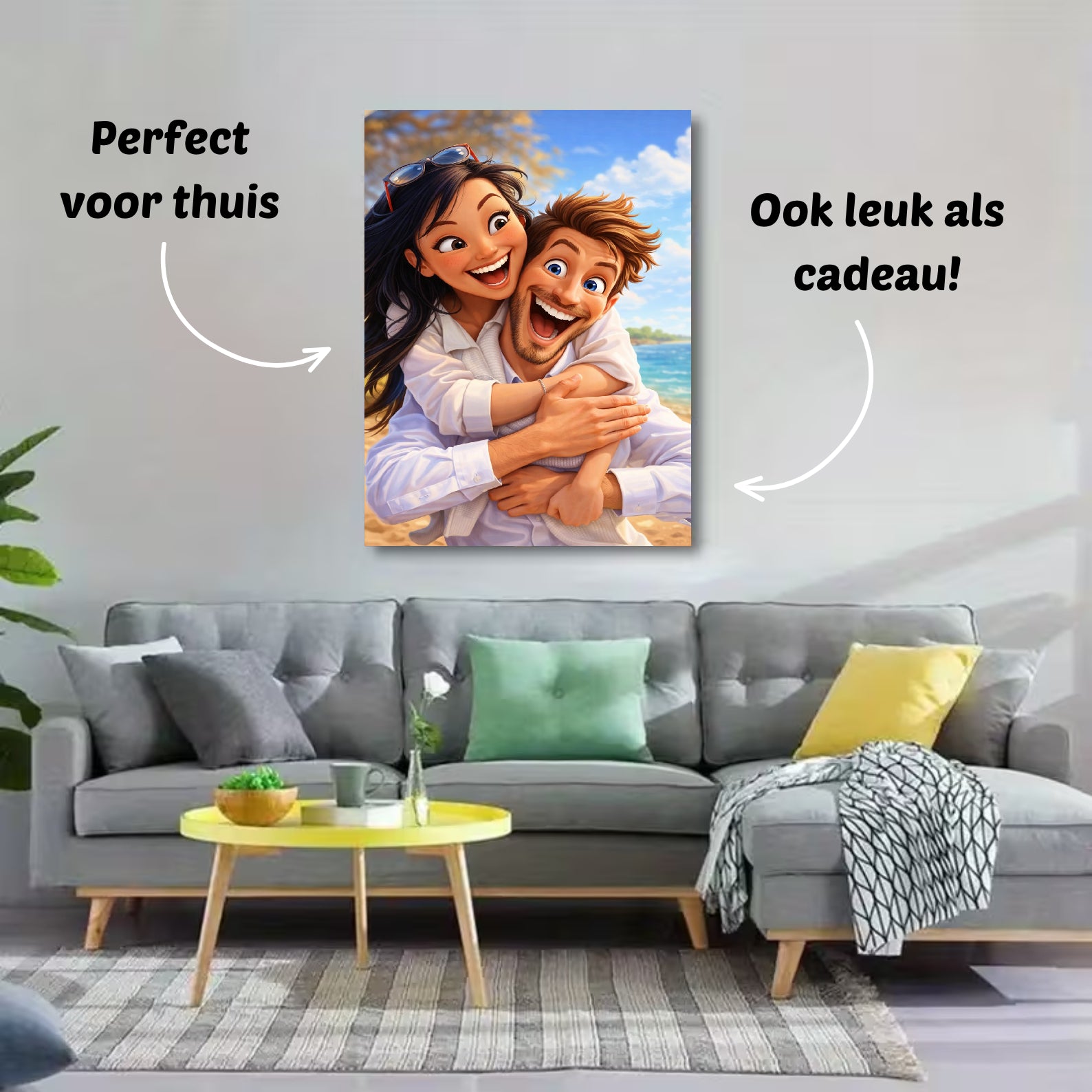 Onze foto’s op canvas zijn verkrijgbaar in verschillende formaten: 30×40 cm, 40×60 cm, 60×90 cm en 80×120 cm. Zo vind je altijd het formaat dat perfect bij jouw ruimte past — van een subtiel accent tot een opvallend groot cartoonportret aan de muur.