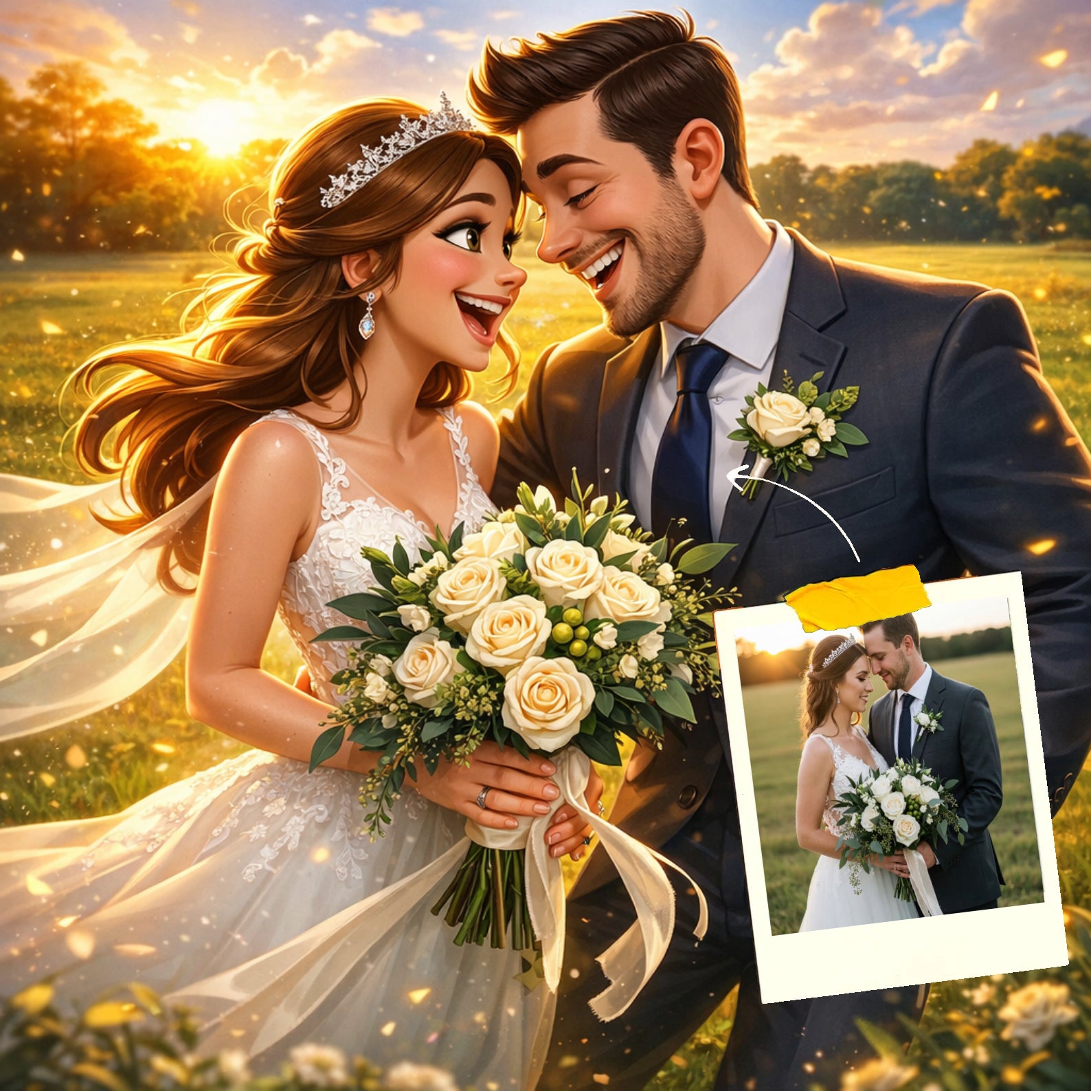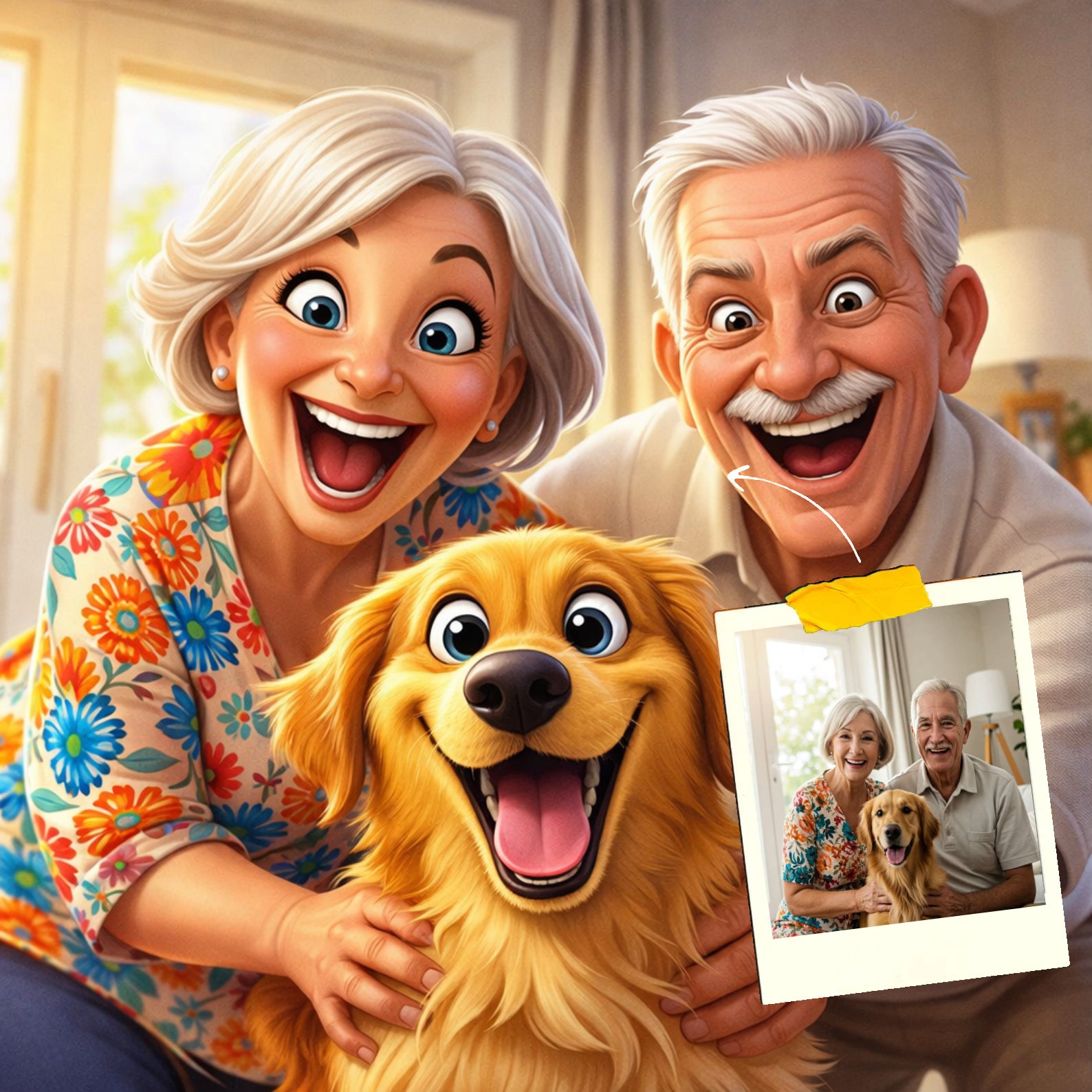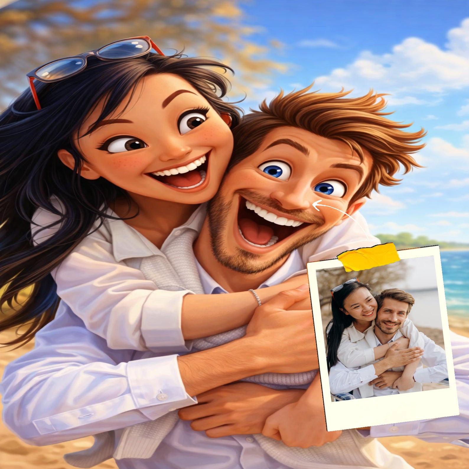 Elk cartoonportret wordt handgemaakt in Adobe Photoshop, met behulp van AI-tools en jouw foto als basis. Onze getalenteerde artiesten letten op elk detail, zodat jouw portret lijkt op de originele foto… maar dan met een unieke, vrolijke twist!
