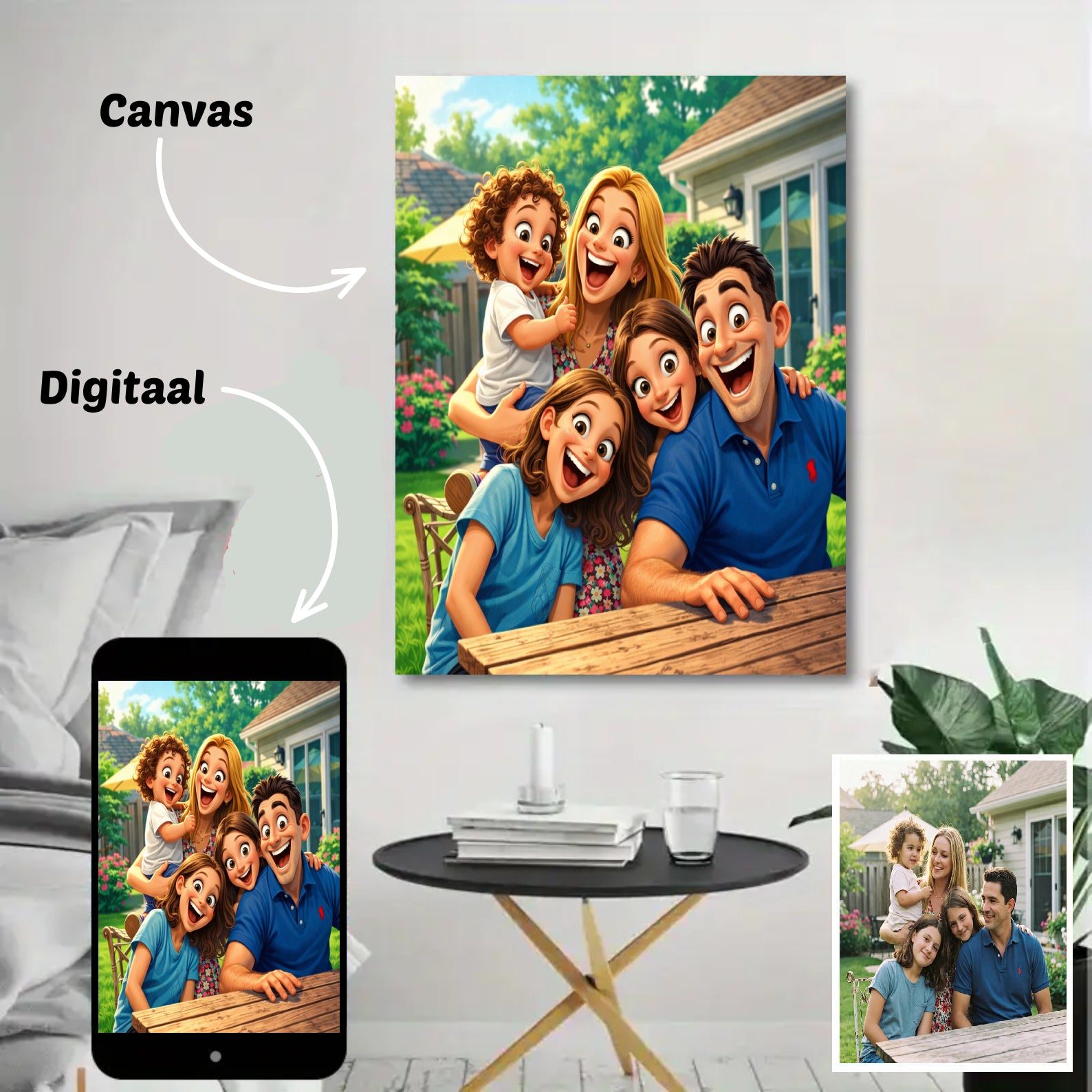 Onze canvasfoto’s worden gedrukt op duurzaam, hoogwaardig canvas met levendige kleuren. Het doek wordt strak gespannen over een stevig houten frame van 2 cm dik, zodat jouw unieke cartoonportret jarenlang mooi blijft pronken aan de muur.