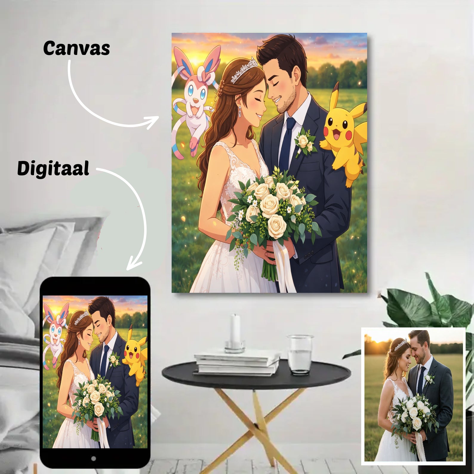 Onze foto’s op canvas zijn verkrijgbaar in verschillende formaten: 30×40 cm, 40×60 cm, 60×90 cm en 80×120 cm. Zo vind je altijd het formaat dat perfect bij jouw ruimte past — van een subtiel accent tot een opvallend groot cartoonportret aan de muur.