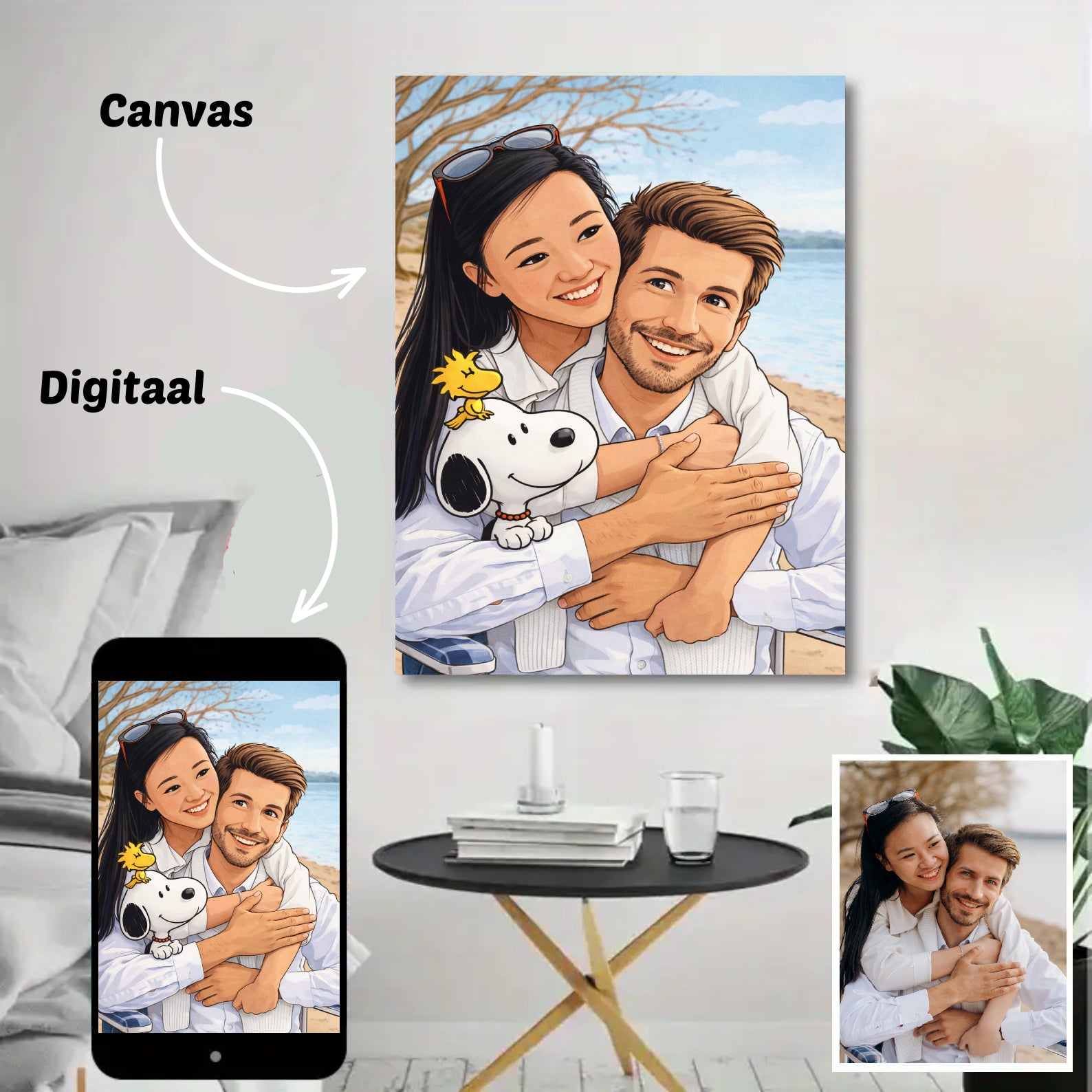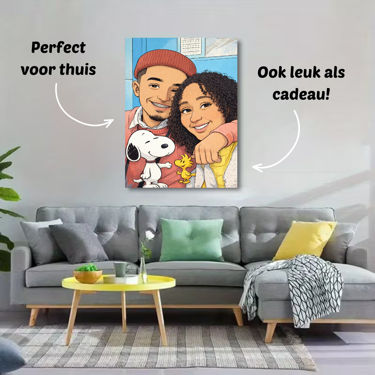 Onze foto’s op canvas zijn verkrijgbaar in verschillende formaten: 30×40 cm, 40×60 cm, 60×90 cm en 80×120 cm. Zo vind je altijd het formaat dat perfect bij jouw ruimte past — van een subtiel accent tot een opvallend groot cartoonportret aan de muur.