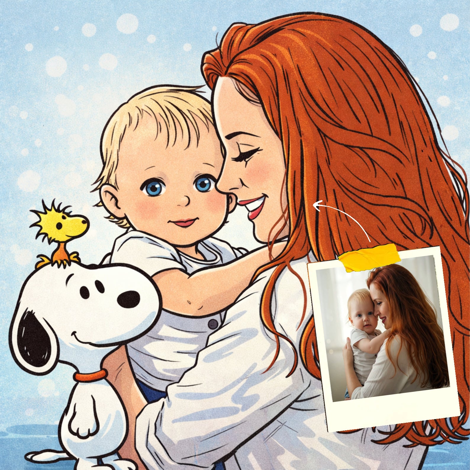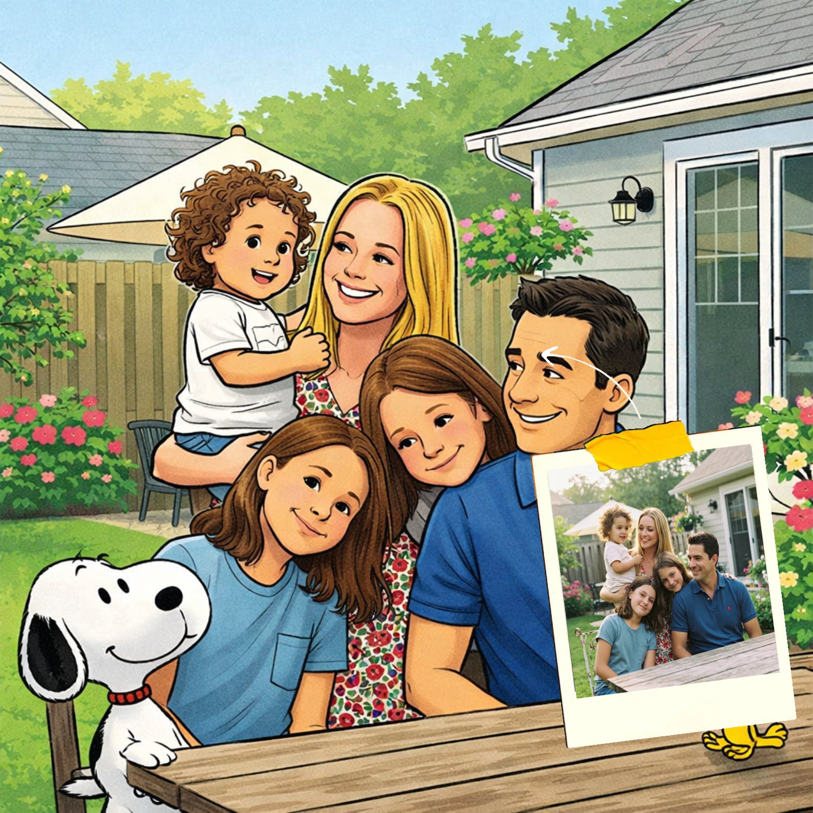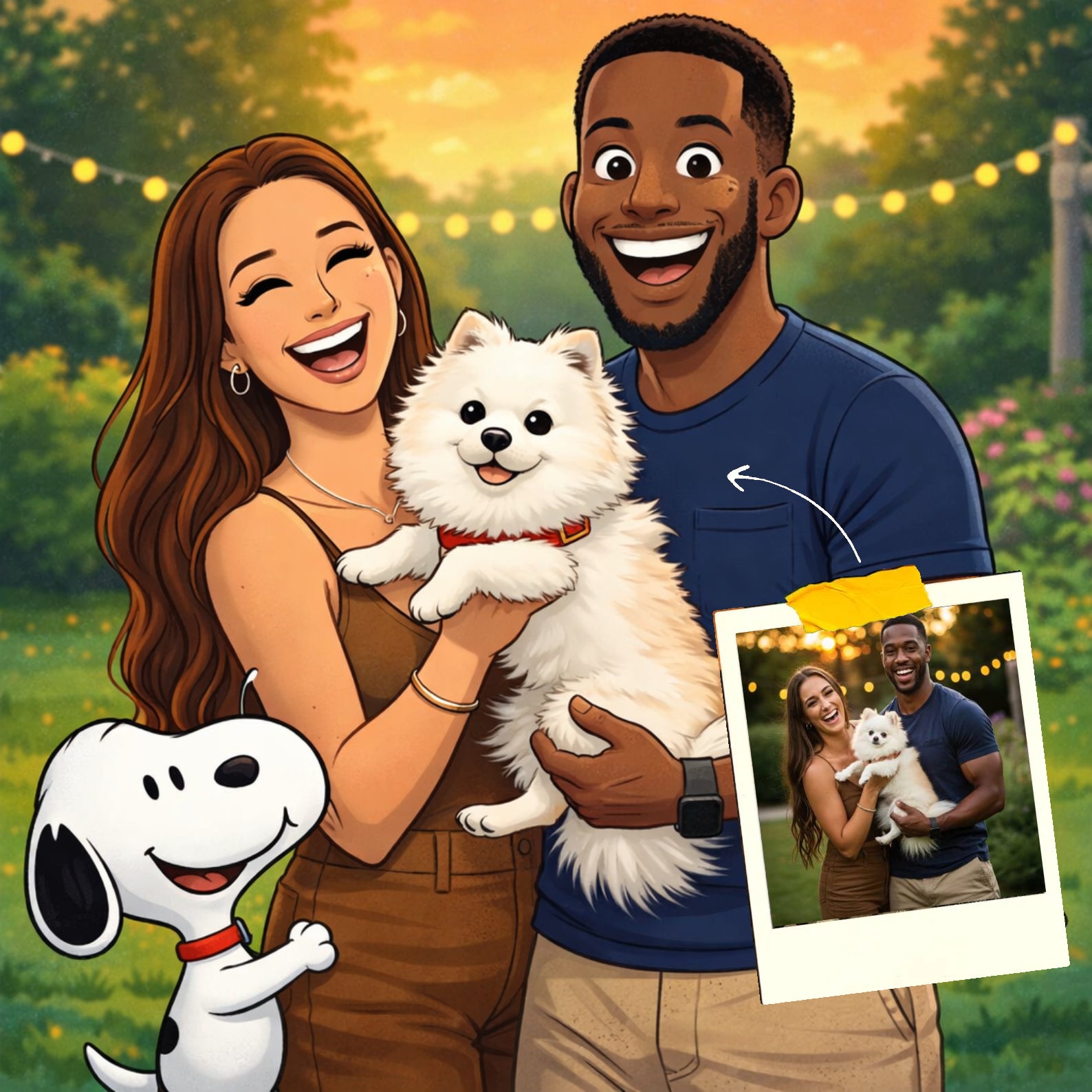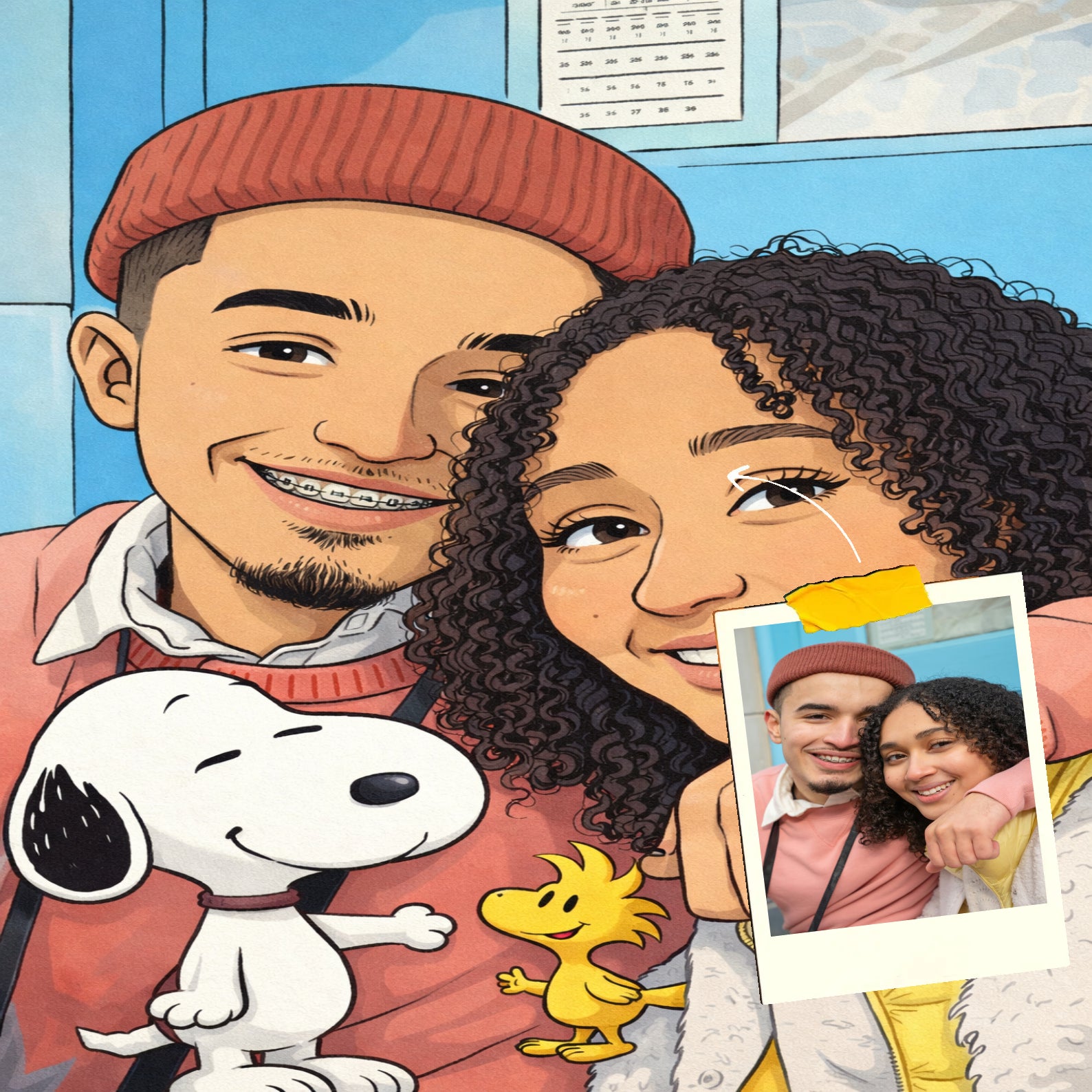 Elk cartoonportret wordt handgemaakt in Adobe Photoshop, met behulp van AI-tools en jouw foto als basis. Onze getalenteerde artiesten letten op elk detail, zodat jouw portret lijkt op de originele foto… maar dan met een unieke, vrolijke twist!