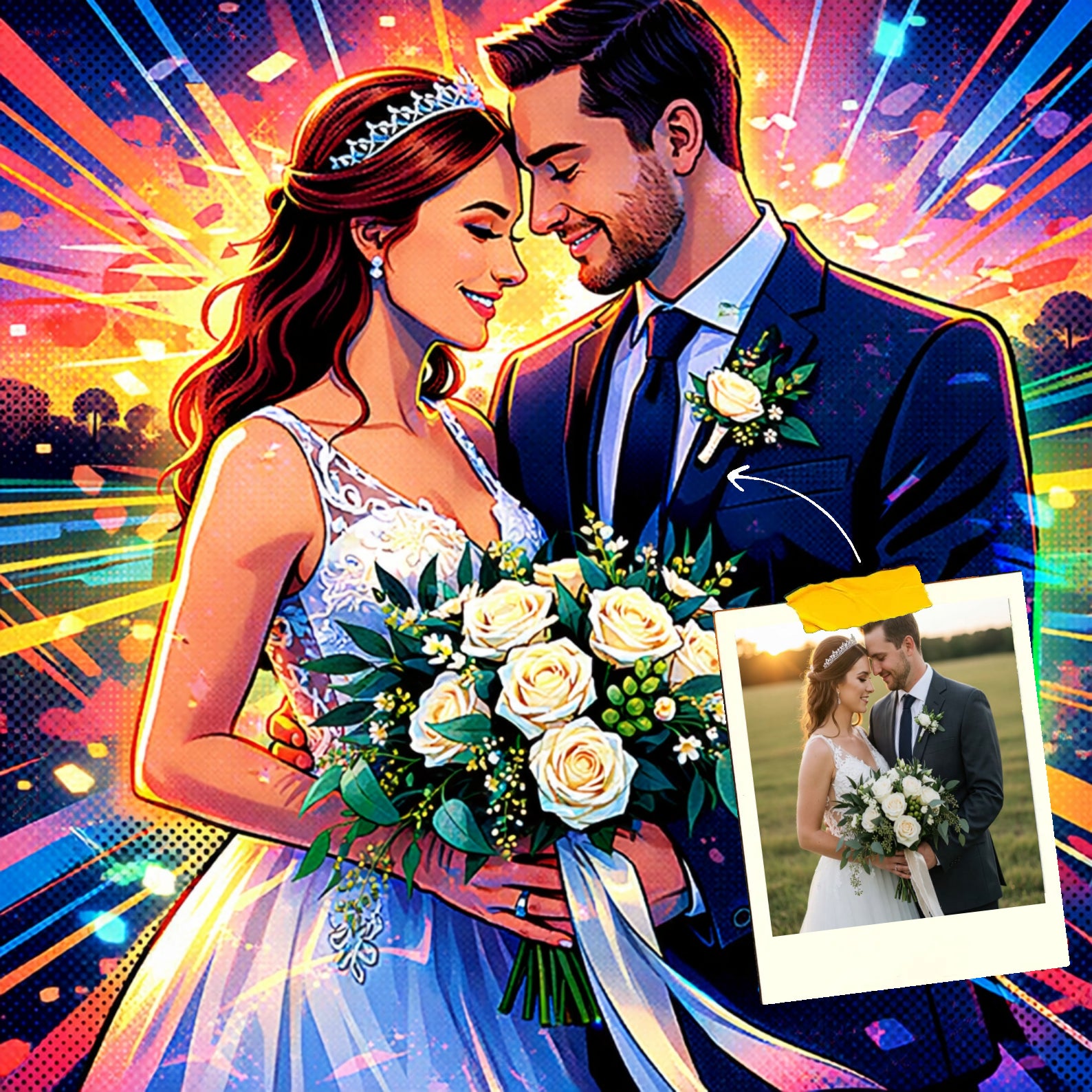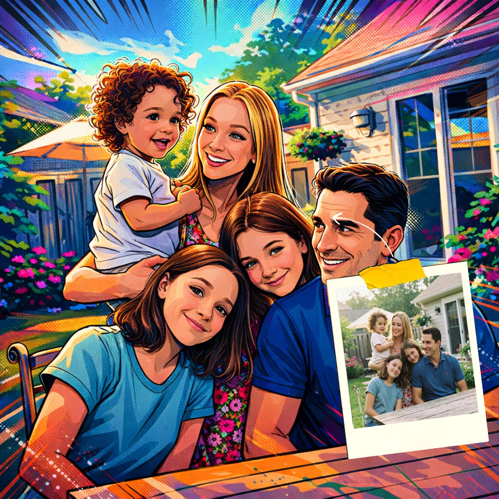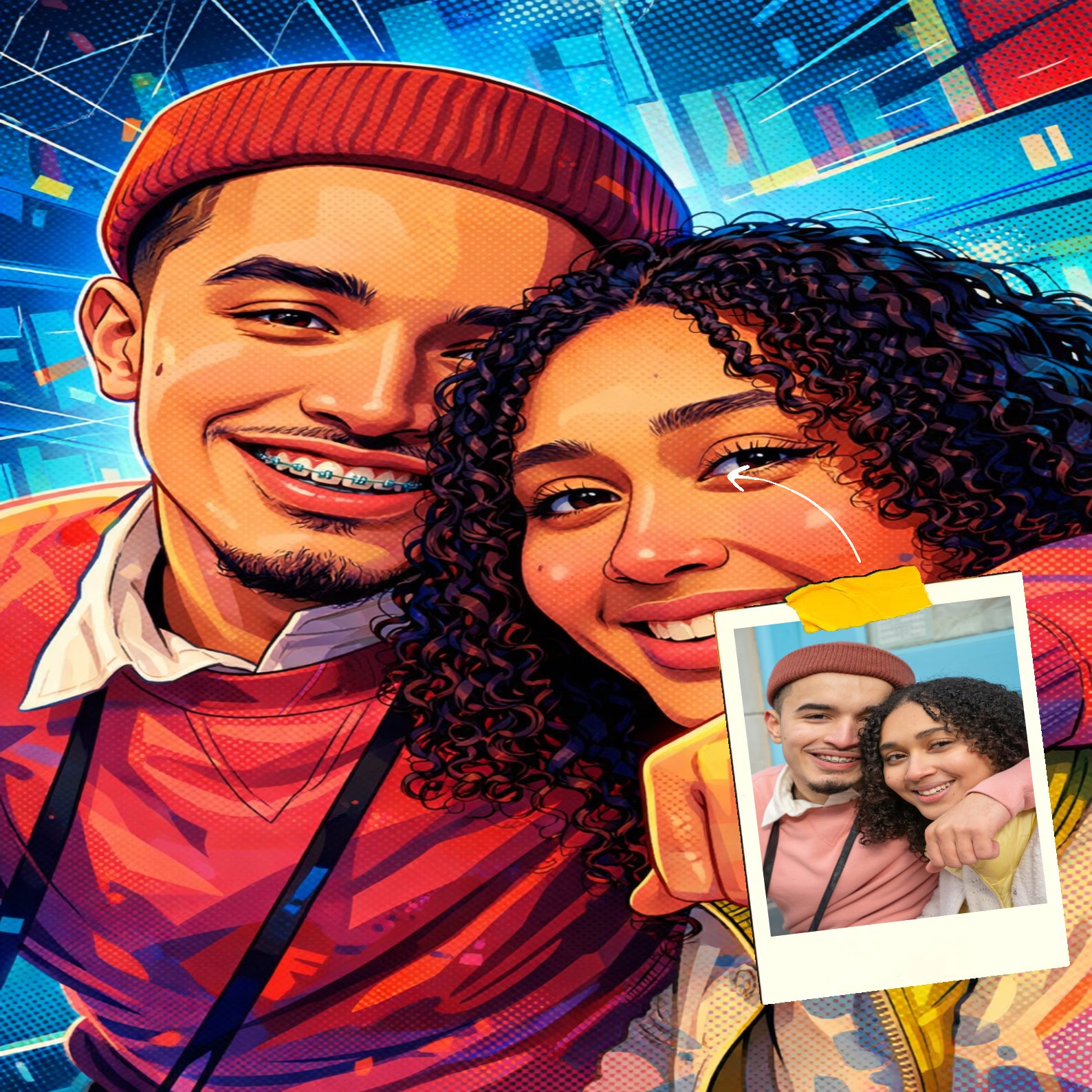 Elk cartoonportret wordt handgemaakt in Adobe Photoshop, met behulp van AI-tools en jouw foto als basis. Onze getalenteerde artiesten letten op elk detail, zodat jouw portret lijkt op de originele foto… maar dan met een unieke, vrolijke twist!