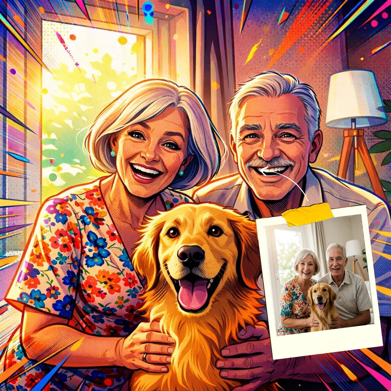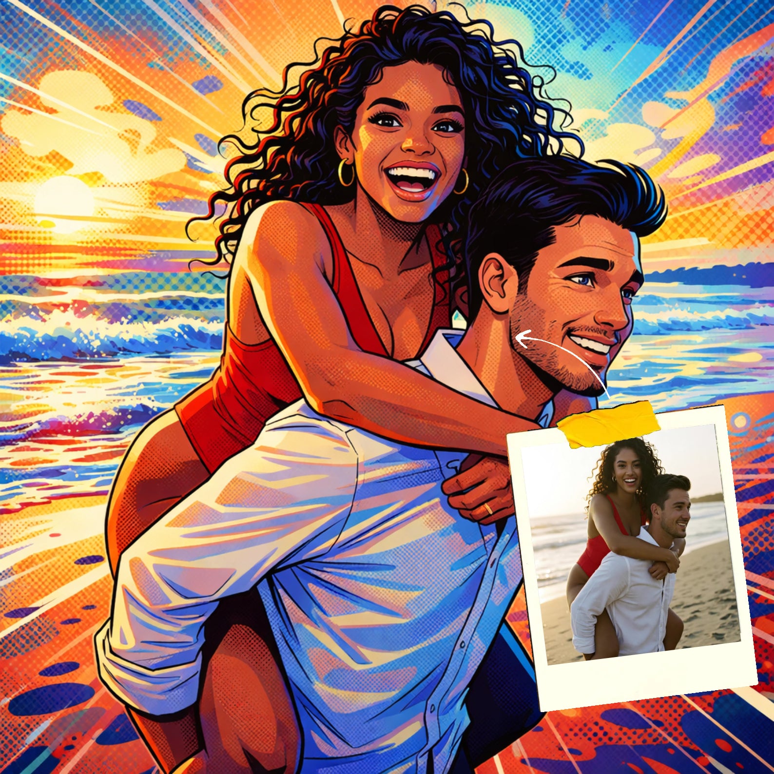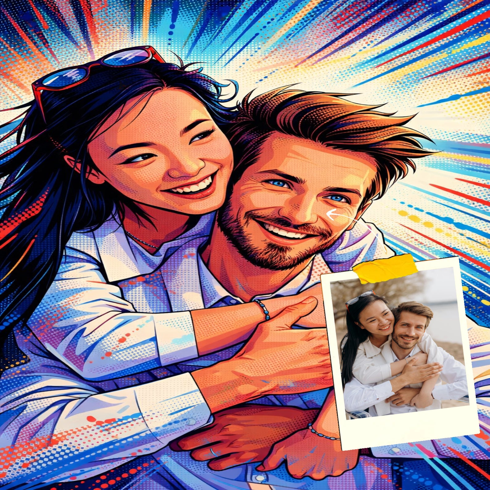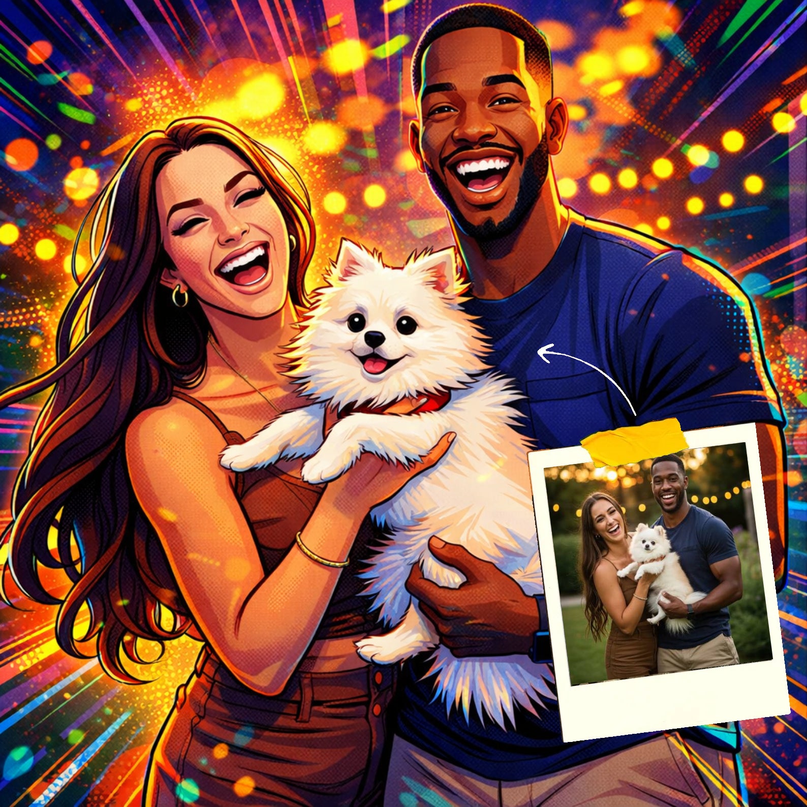 Elk cartoonportret wordt handgemaakt in Adobe Photoshop, met behulp van AI-tools en jouw foto als basis. Onze getalenteerde artiesten letten op elk detail, zodat jouw portret lijkt op de originele foto… maar dan met een unieke, vrolijke twist!