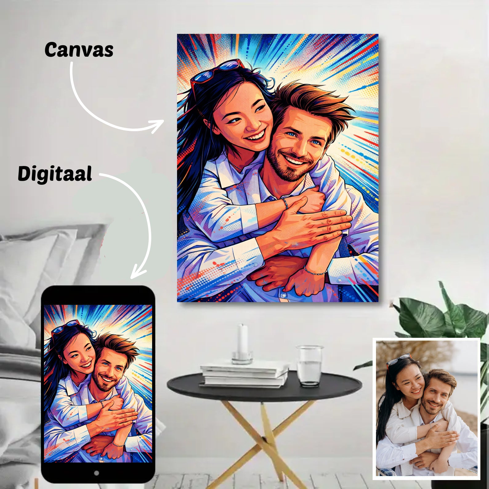 Canvas: ontvang je portret geprint op canvas, inclusief houten frame — direct klaar om op te hangen.