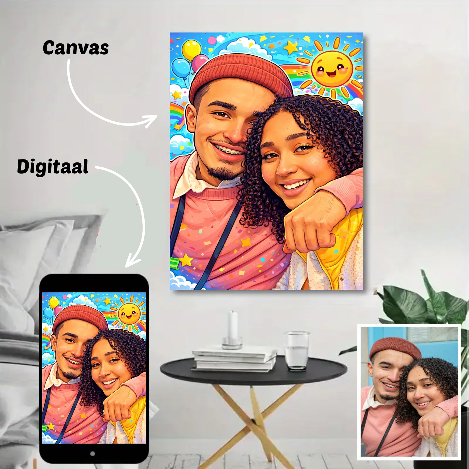 Onze canvasfoto’s worden gedrukt op duurzaam, hoogwaardig canvas met levendige kleuren. Het doek wordt strak gespannen over een stevig houten frame van 2 cm dik, zodat jouw unieke cartoonportret jarenlang mooi blijft pronken aan de muur.