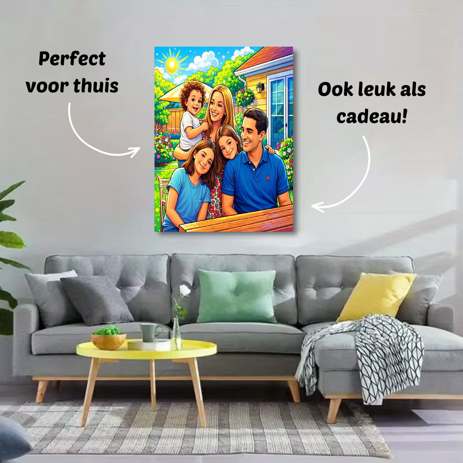 Onze foto’s op canvas zijn verkrijgbaar in verschillende formaten: 30×40 cm, 40×60 cm, 60×90 cm en 80×120 cm. Zo vind je altijd het formaat dat perfect bij jouw ruimte past — van een subtiel accent tot een opvallend groot cartoonportret aan de muur.
