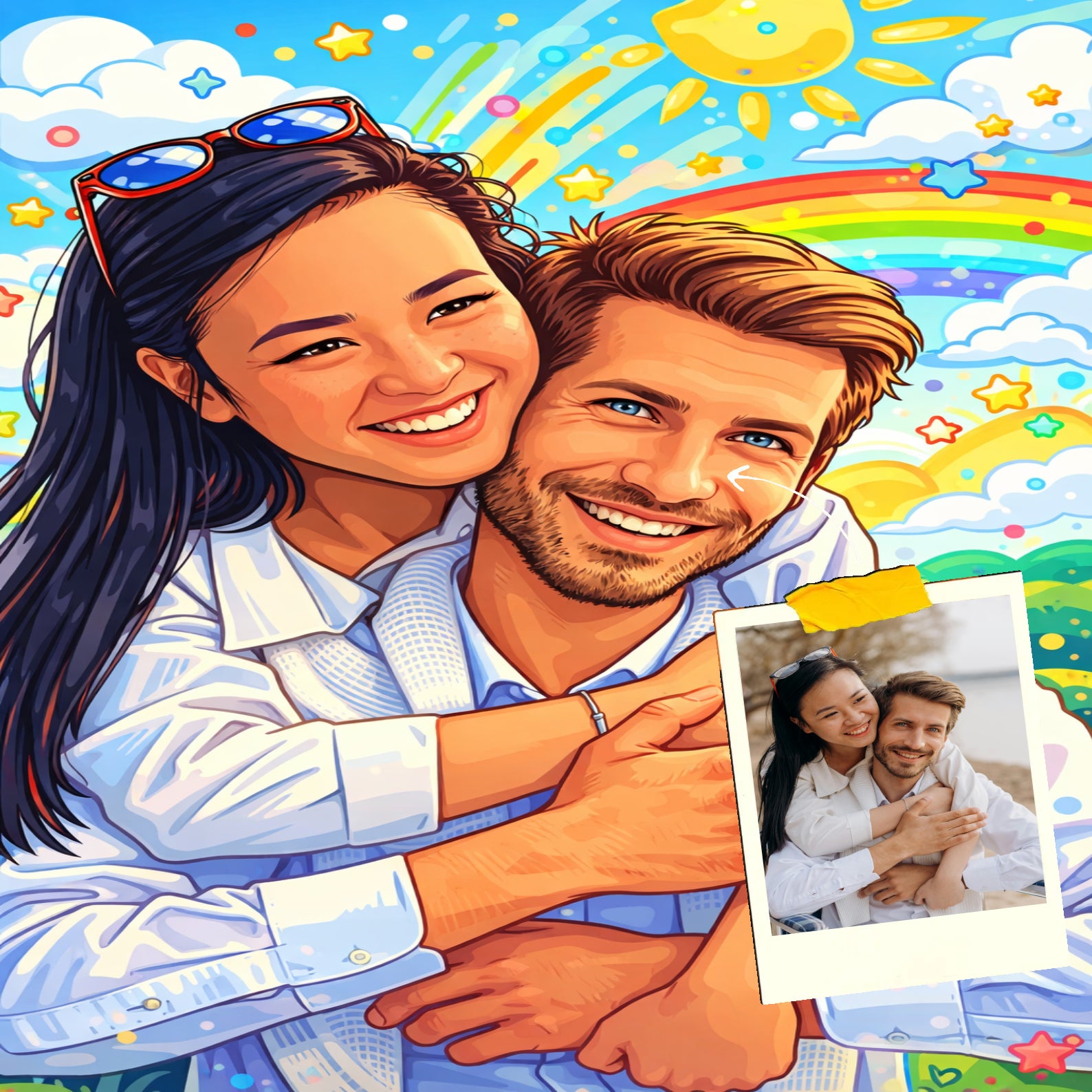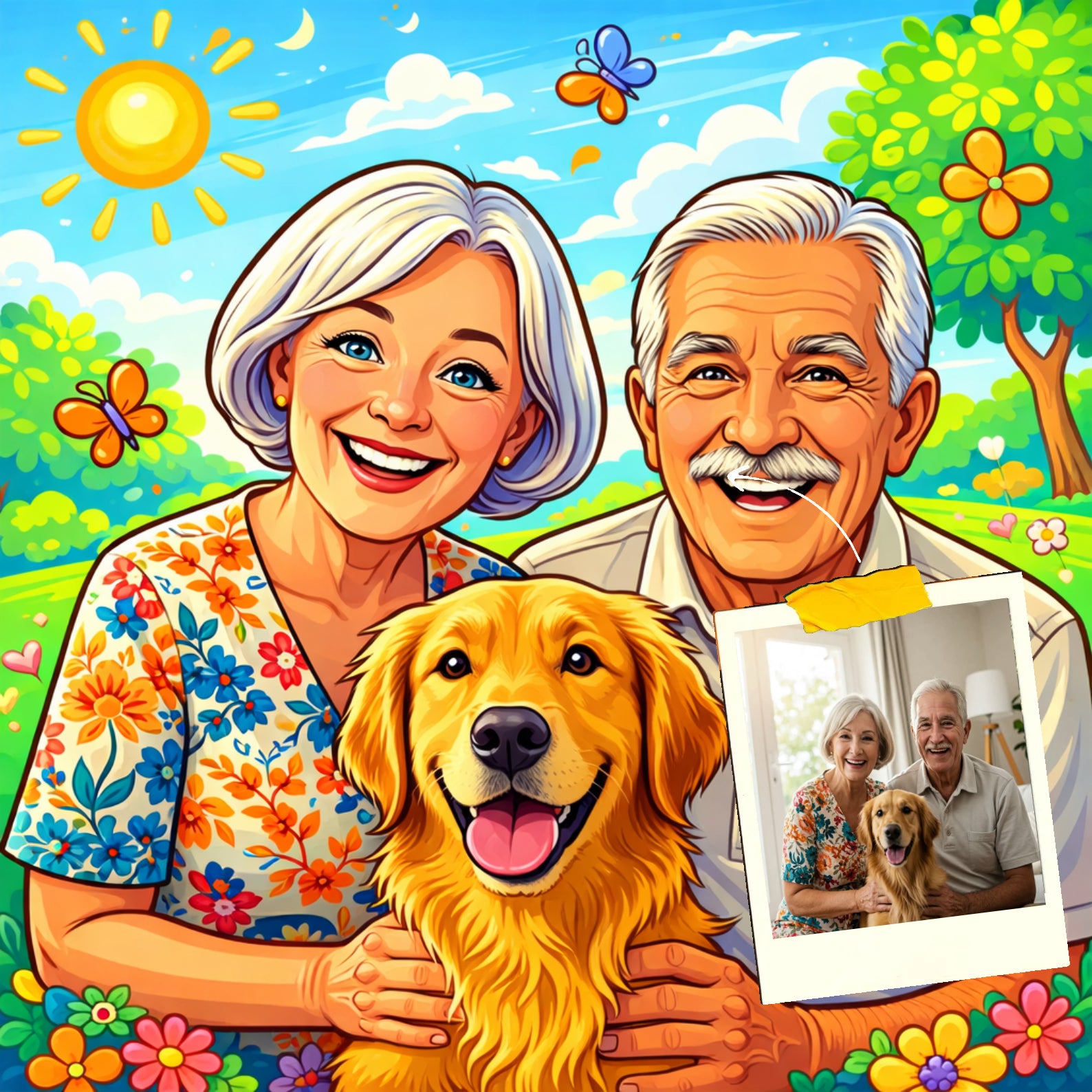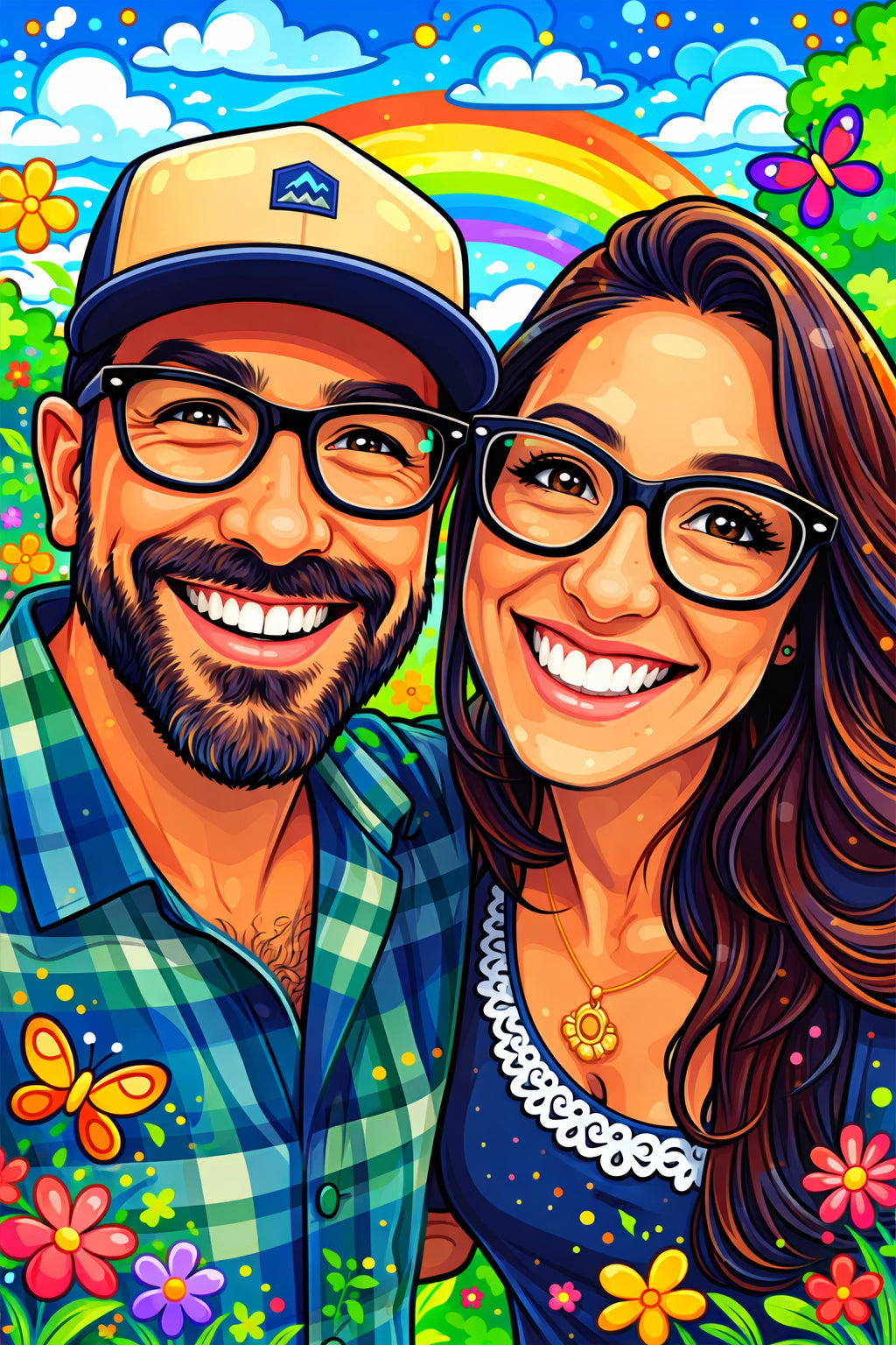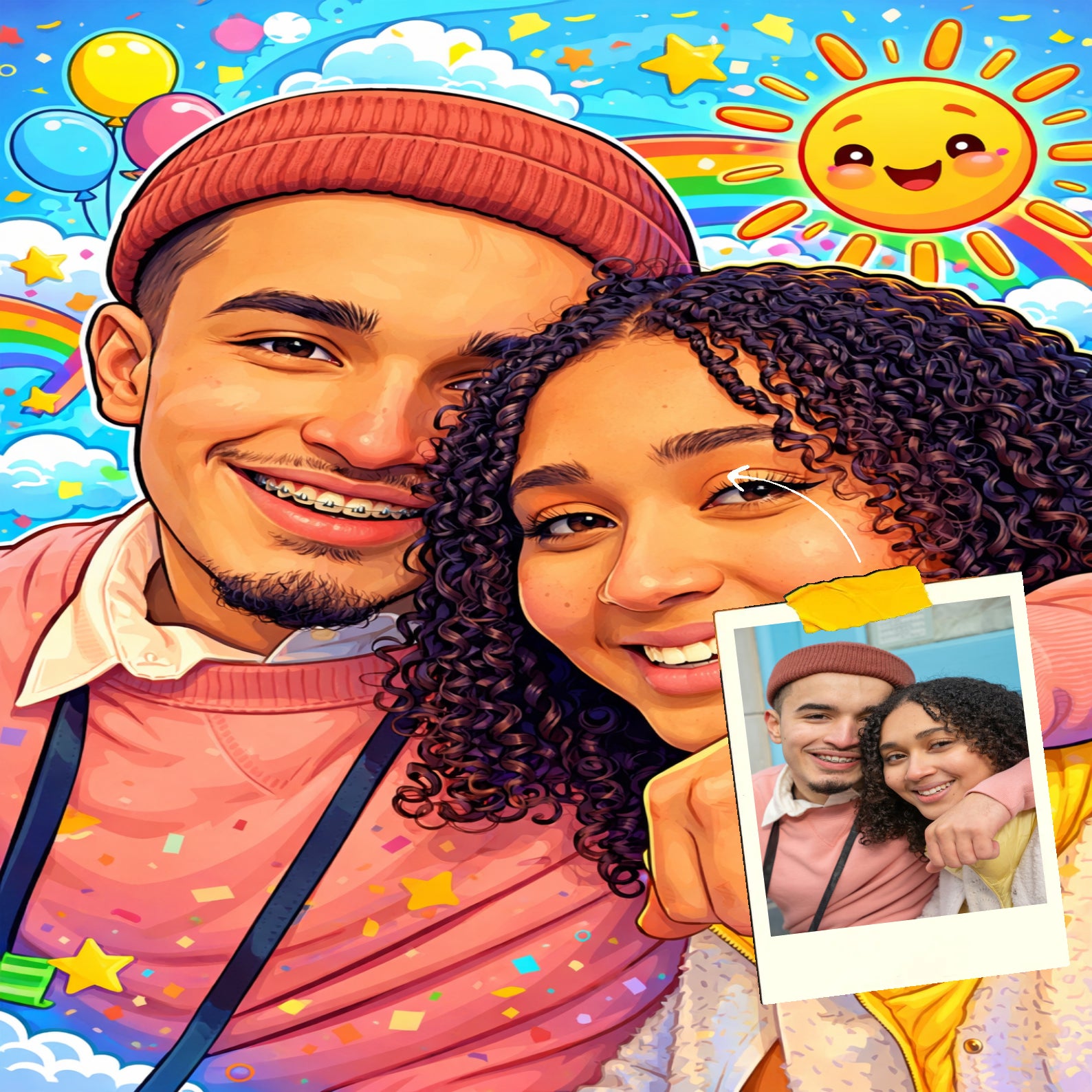 Elk cartoonportret wordt handgemaakt in Adobe Photoshop, met behulp van AI-tools en jouw foto als basis. Onze getalenteerde artiesten letten op elk detail, zodat jouw portret lijkt op de originele foto… maar dan met een unieke, vrolijke twist!