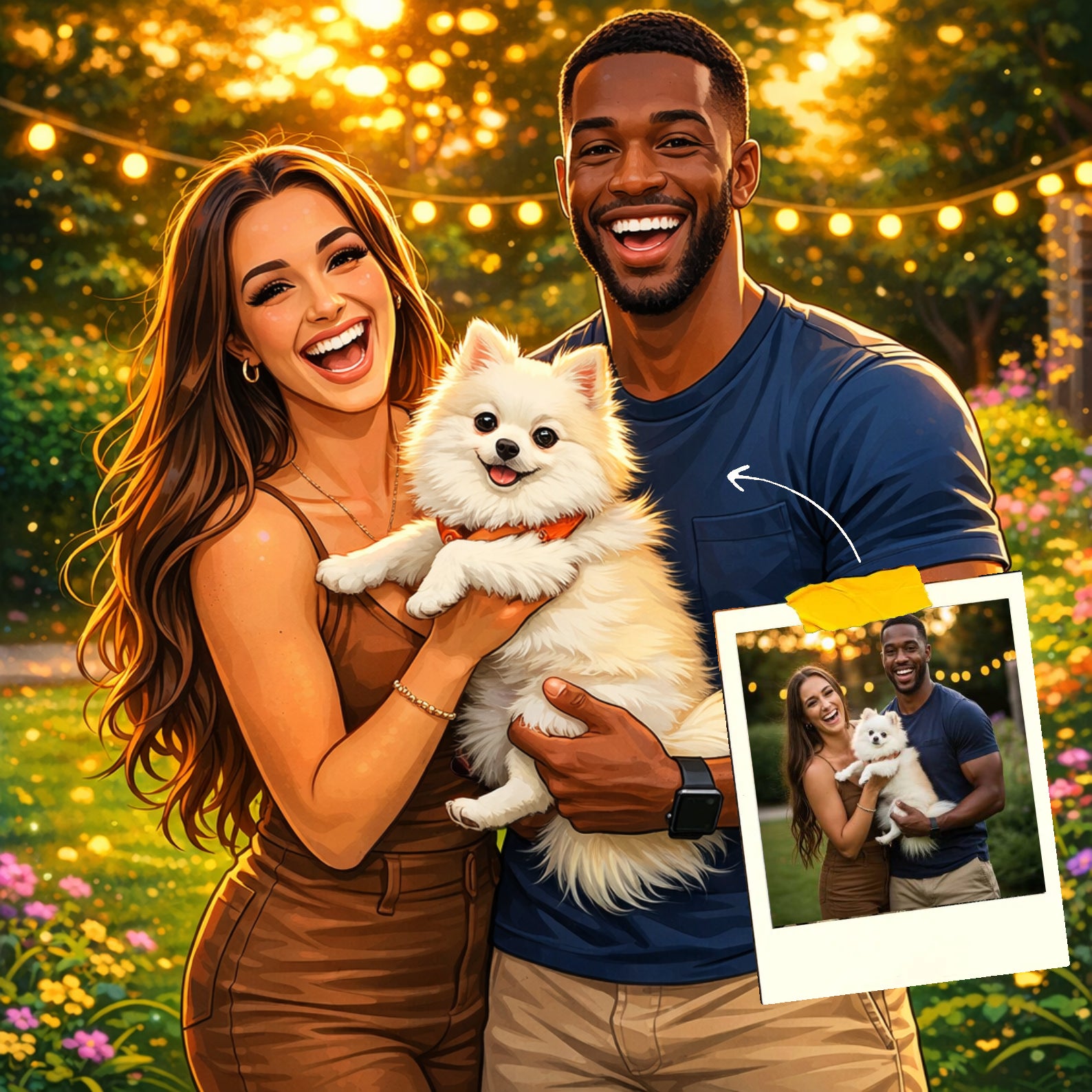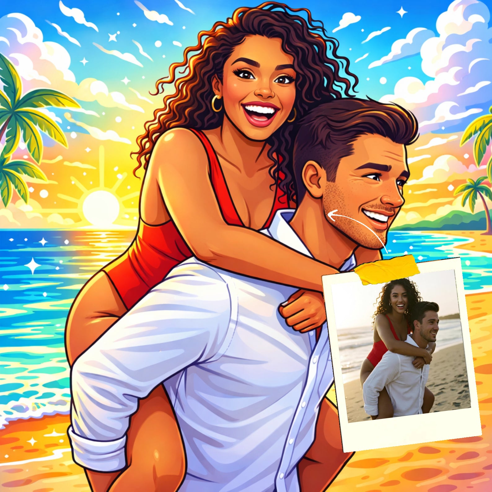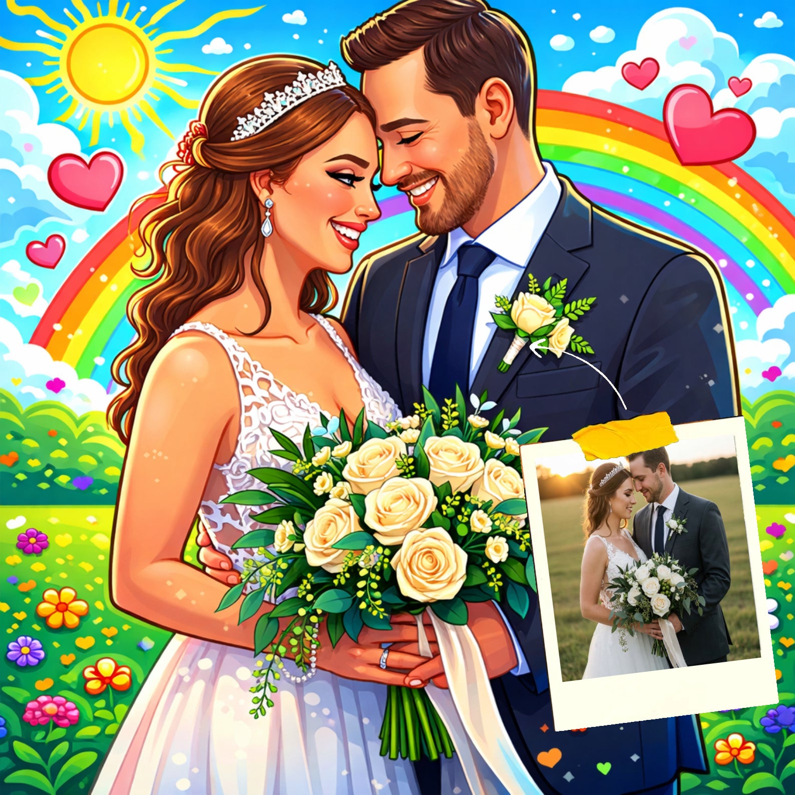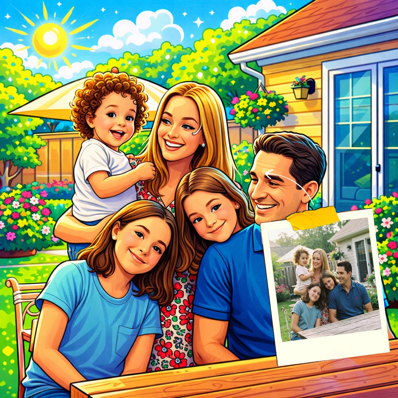 Elk cartoonportret wordt handgemaakt in Adobe Photoshop, met behulp van AI-tools en jouw foto als basis. Onze getalenteerde artiesten letten op elk detail, zodat jouw portret lijkt op de originele foto… maar dan met een unieke, vrolijke twist!