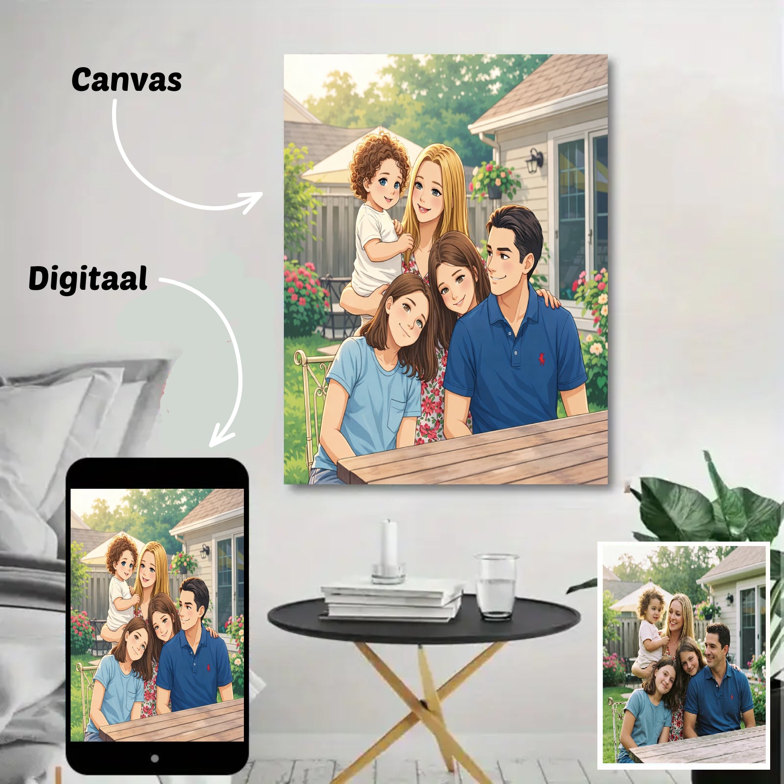 Canvas: ontvang je portret geprint op canvas, inclusief houten frame — direct klaar om op te hangen.