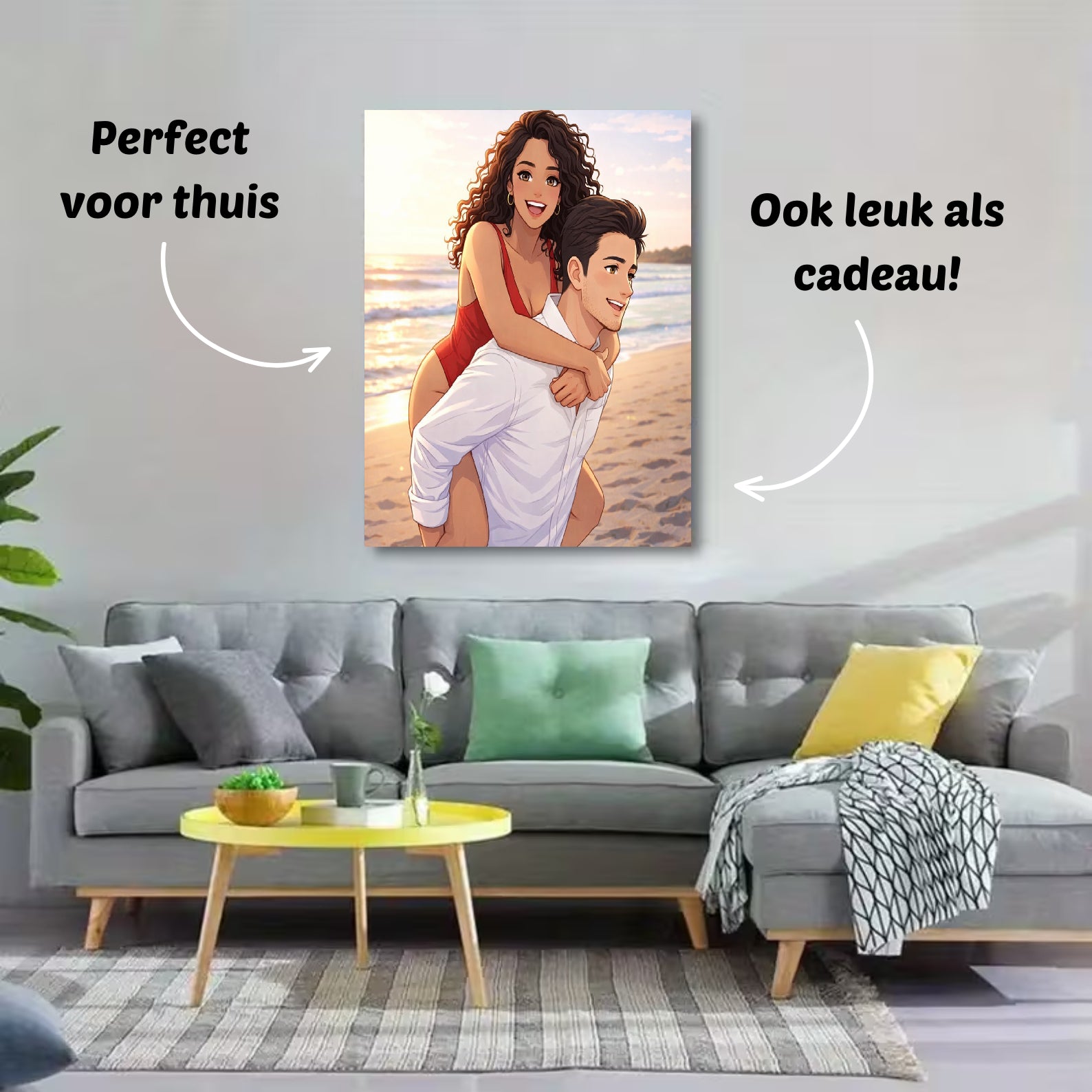 Onze foto’s op canvas zijn verkrijgbaar in verschillende formaten: 30×40 cm, 40×60 cm, 60×90 cm en 80×120 cm. Zo vind je altijd het formaat dat perfect bij jouw ruimte past — van een subtiel accent tot een opvallend groot cartoonportret aan de muur.