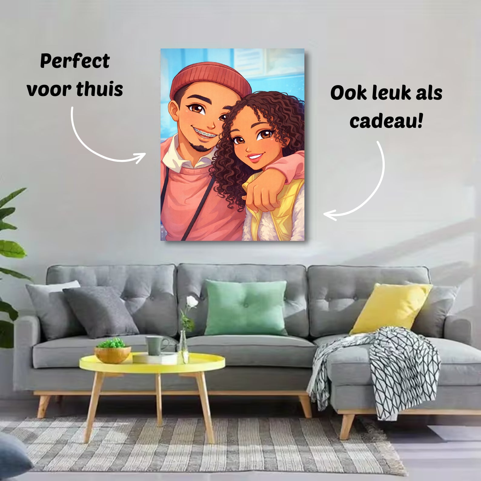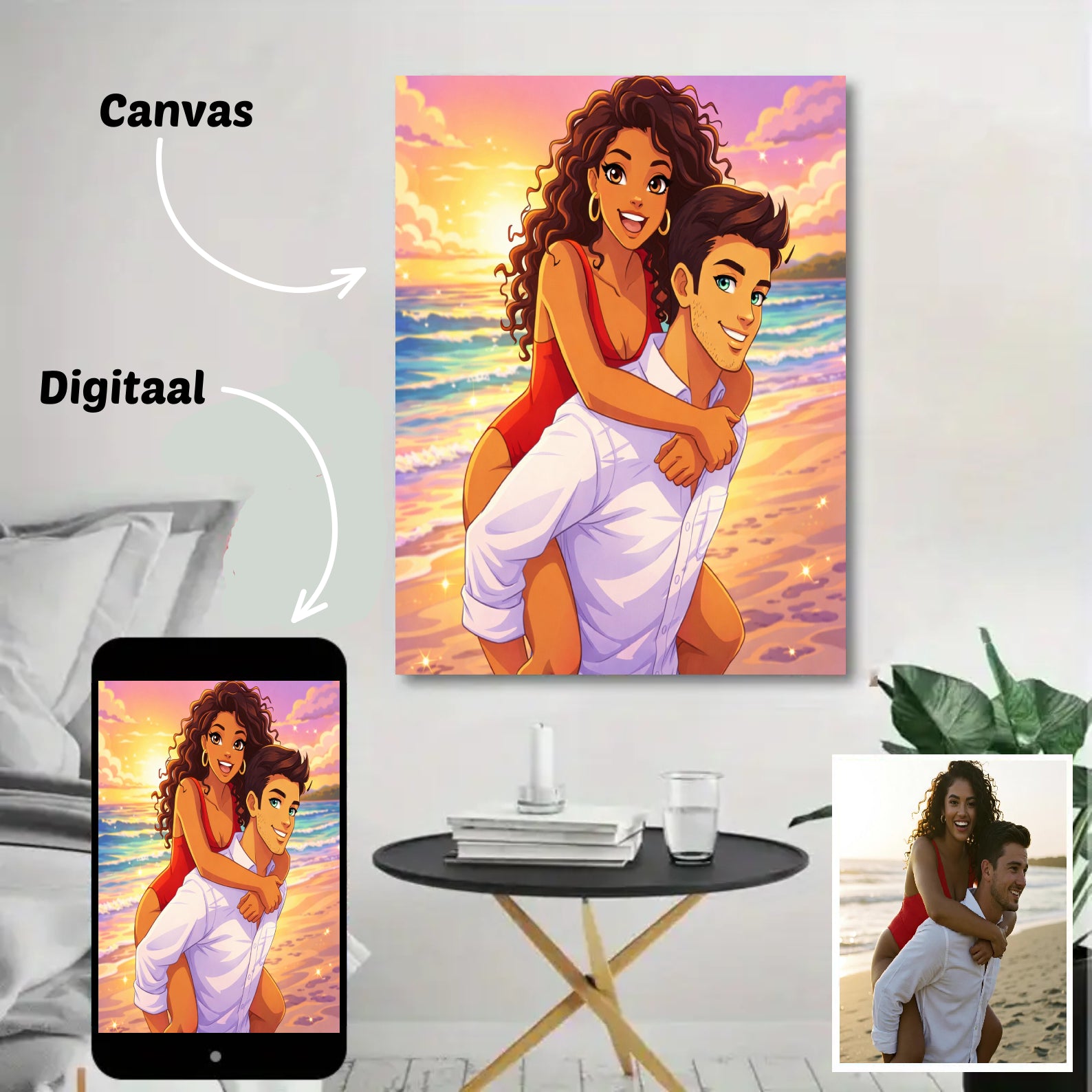 Onze foto’s op canvas zijn verkrijgbaar in verschillende formaten: 30×40 cm, 40×60 cm, 60×90 cm en 80×120 cm. Zo vind je altijd het formaat dat perfect bij jouw ruimte past — van een subtiel accent tot een opvallend groot cartoonportret aan de muur.