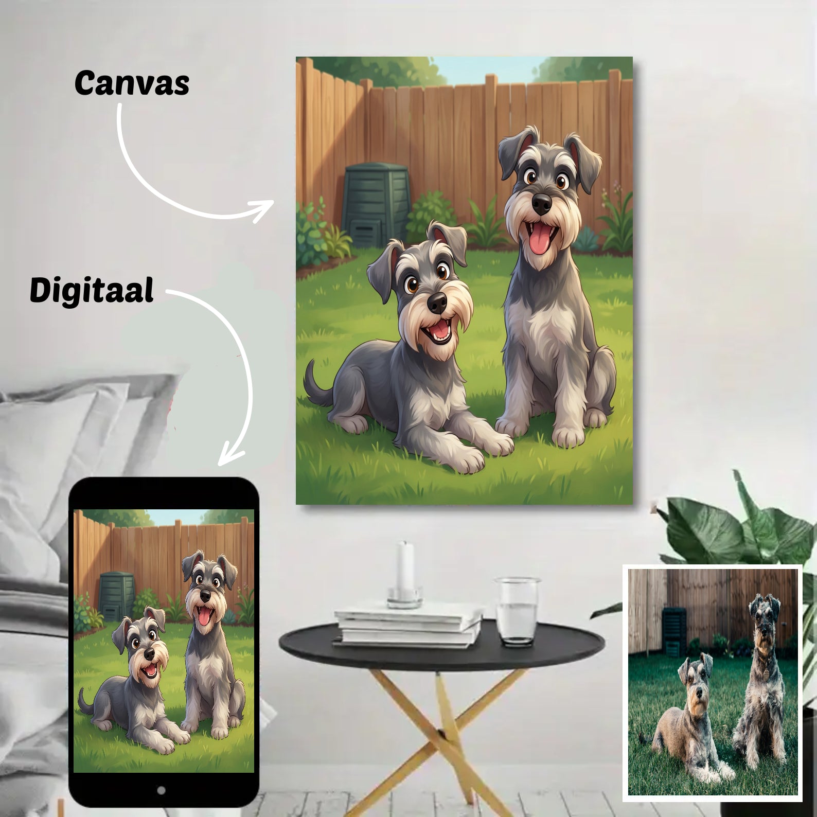 Heb je je ooit afgevraagd hoe je hond eruitziet als cartoon? Nu kun je het ontdekken! Wij maken van jouw hondenfoto een uniek en persoonlijk cartoonportret. Perfect voor jezelf of als origineel cadeau voor echte hondenliefhebbers.