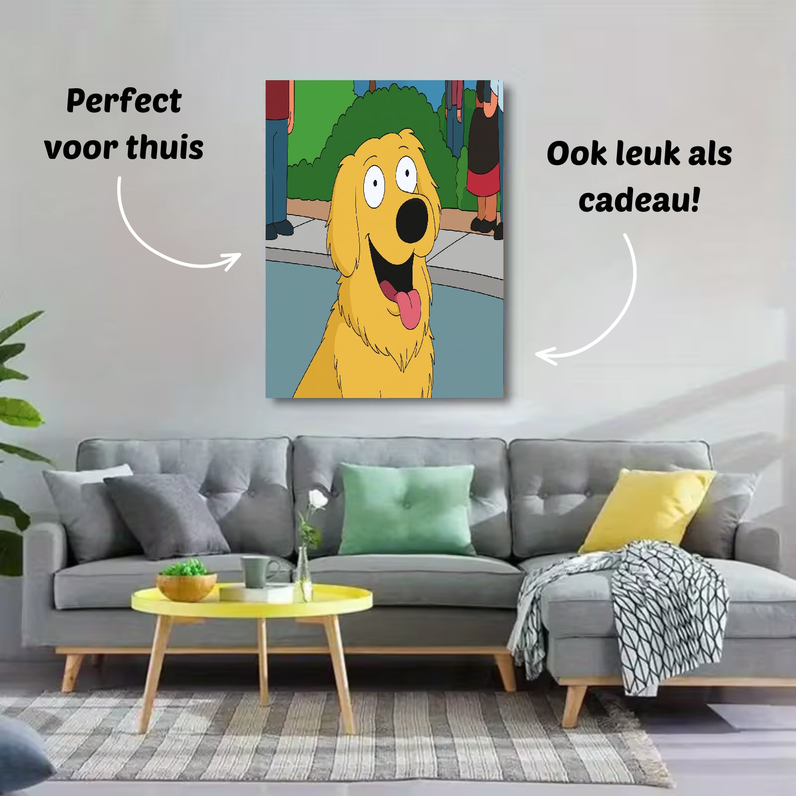 Onze foto’s op canvas zijn verkrijgbaar in verschillende formaten: 30×40 cm, 40×60 cm, 60×90 cm en 80×120 cm. Zo vind je altijd het formaat dat perfect bij jouw ruimte past — van een subtiel accent tot een opvallend groot cartoonportret aan de muur.
