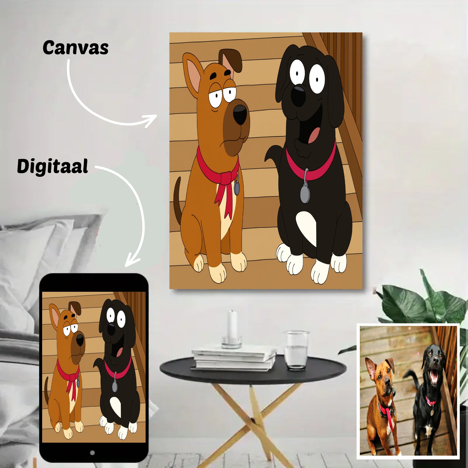 Heb je je ooit afgevraagd hoe je hond eruitziet als cartoon? Nu kun je het ontdekken! Wij maken van jouw hondenfoto een uniek en persoonlijk cartoonportret. Perfect voor jezelf of als origineel cadeau voor echte hondenliefhebbers.