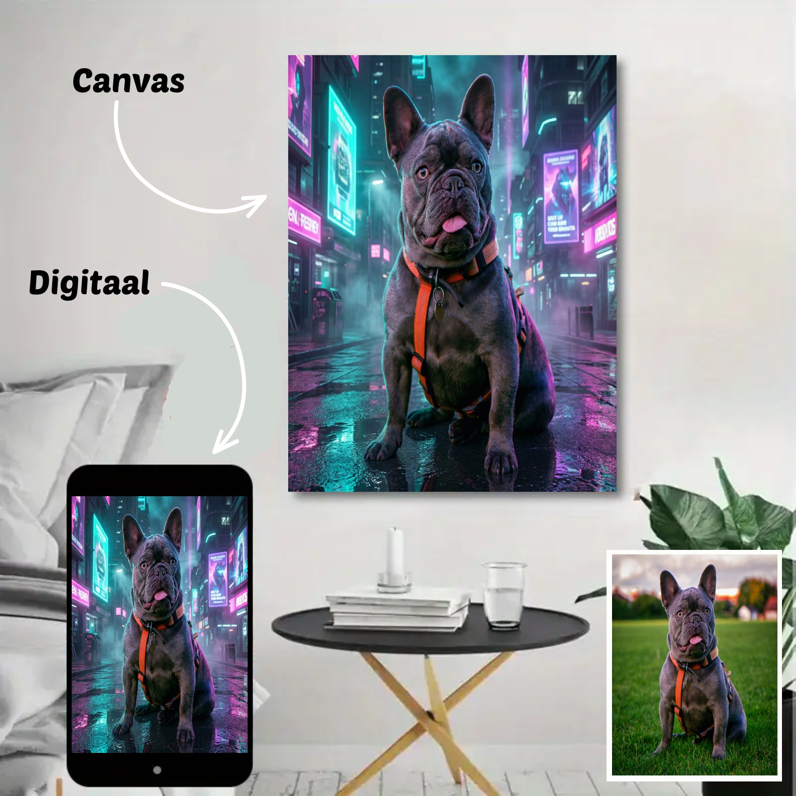 Canvas: ontvang je portret geprint op canvas, inclusief houten frame — direct klaar om op te hangen.
