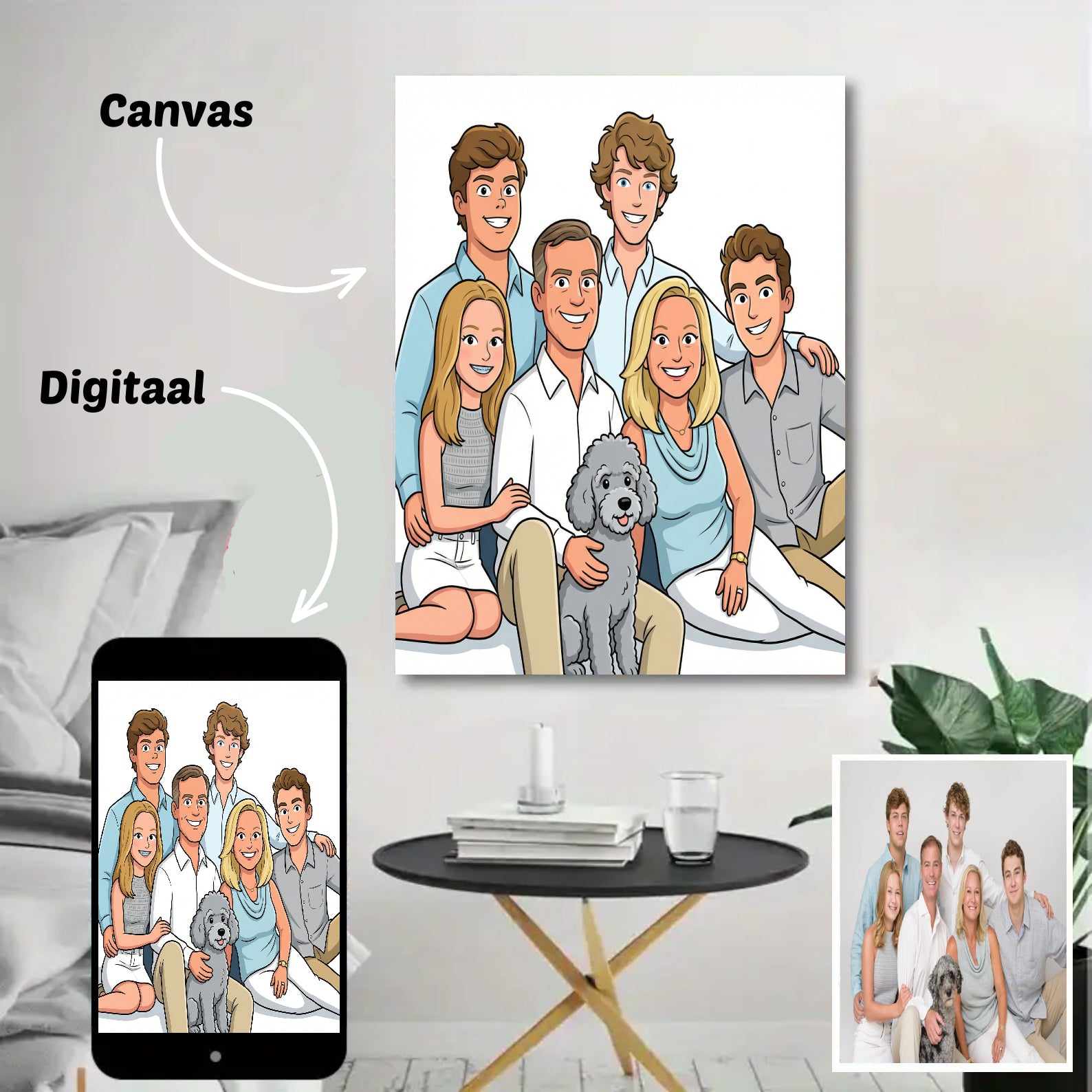 Canvas: ontvang je portret geprint op canvas, inclusief houten frame — direct klaar om op te hangen.