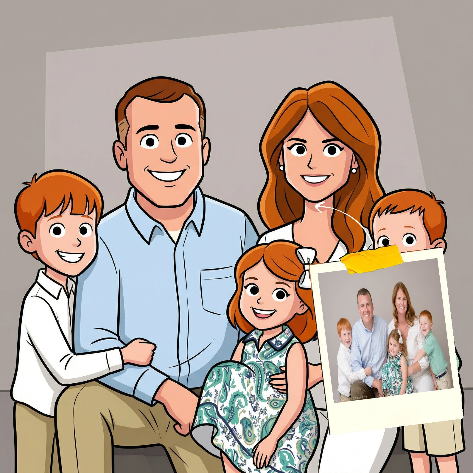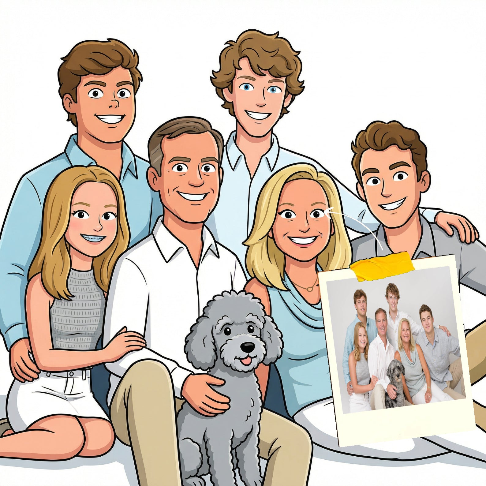 Elk cartoonportret wordt handgemaakt in Adobe Photoshop, met behulp van AI-tools en jouw foto als basis. Onze getalenteerde artiesten letten op elk detail, zodat jouw portret lijkt op de originele foto… maar dan met een unieke, vrolijke twist!