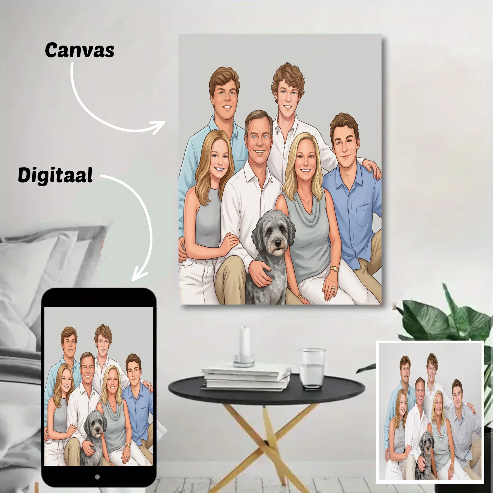 Canvas: ontvang je portret geprint op canvas, inclusief houten frame — direct klaar om op te hangen.