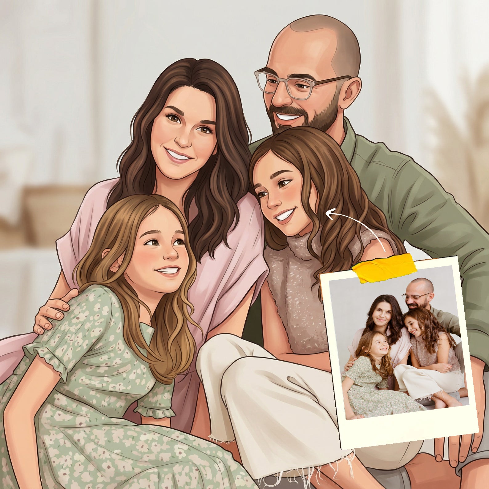 "Wat een fantastisch familieportret! Je herkent iedereen meteen en de kleine details maken het helemaal af. We zijn er superblij mee." – Marieke
