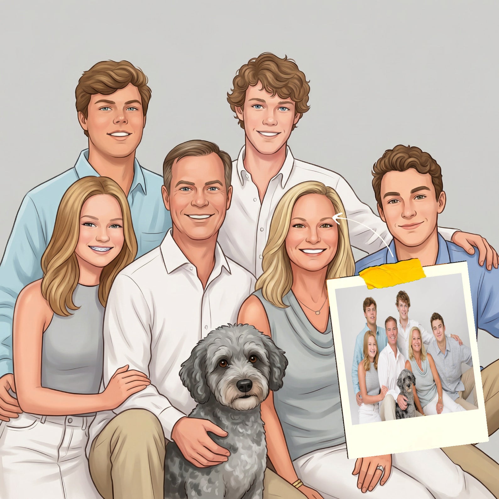 Elk cartoonportret wordt handgemaakt in Adobe Photoshop, met behulp van AI-tools en jouw foto als basis. Onze getalenteerde artiesten letten op elk detail, zodat jouw portret lijkt op de originele foto… maar dan met een unieke, vrolijke twist!