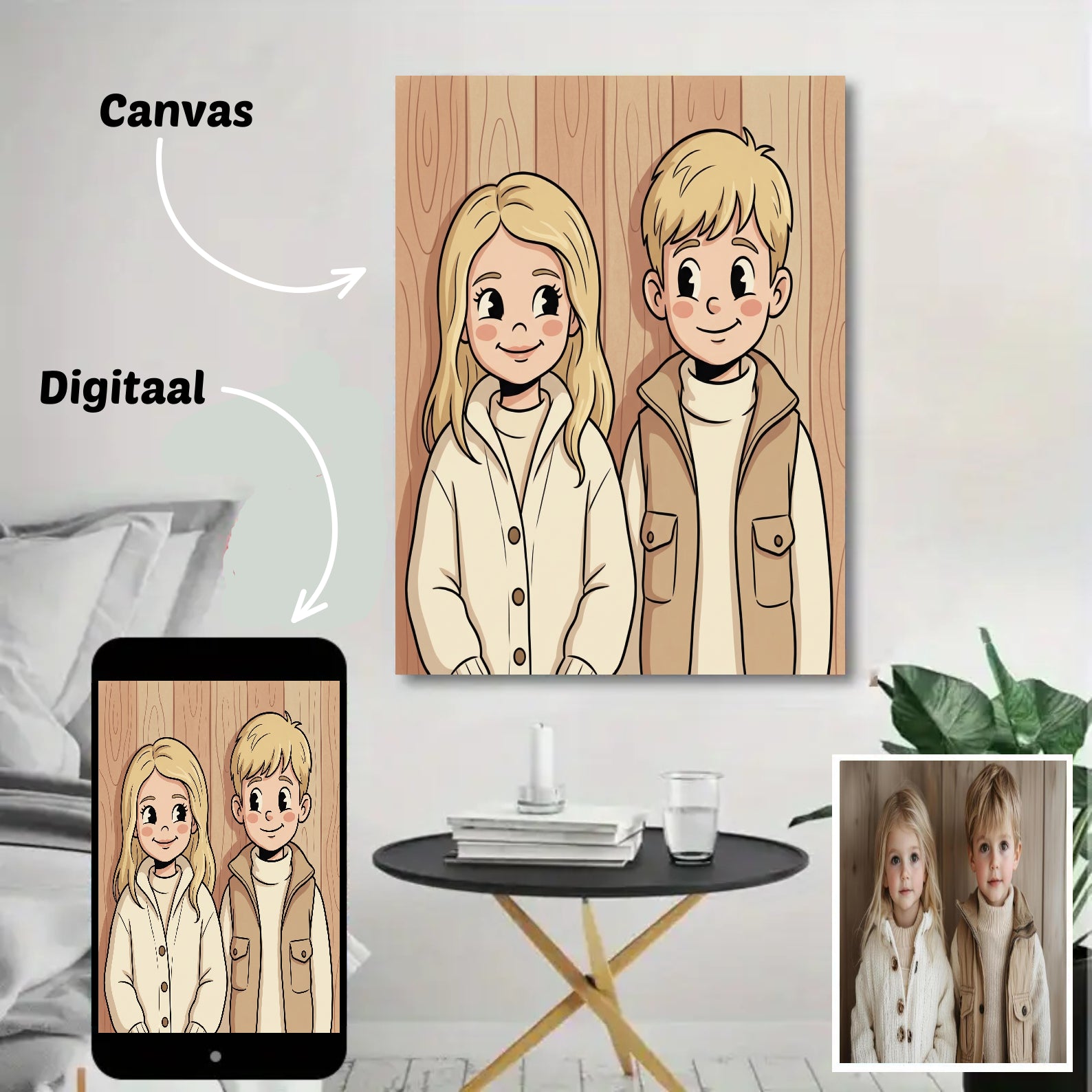 Canvas: ontvang je portret geprint op canvas, inclusief houten frame — direct klaar om op te hangen.