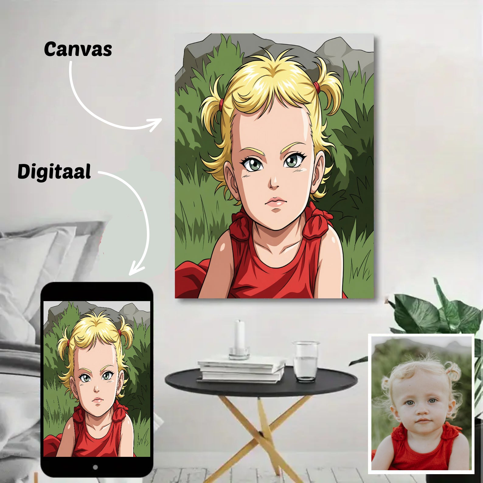 Canvas: ontvang je portret geprint op canvas, inclusief houten frame — direct klaar om op te hangen.