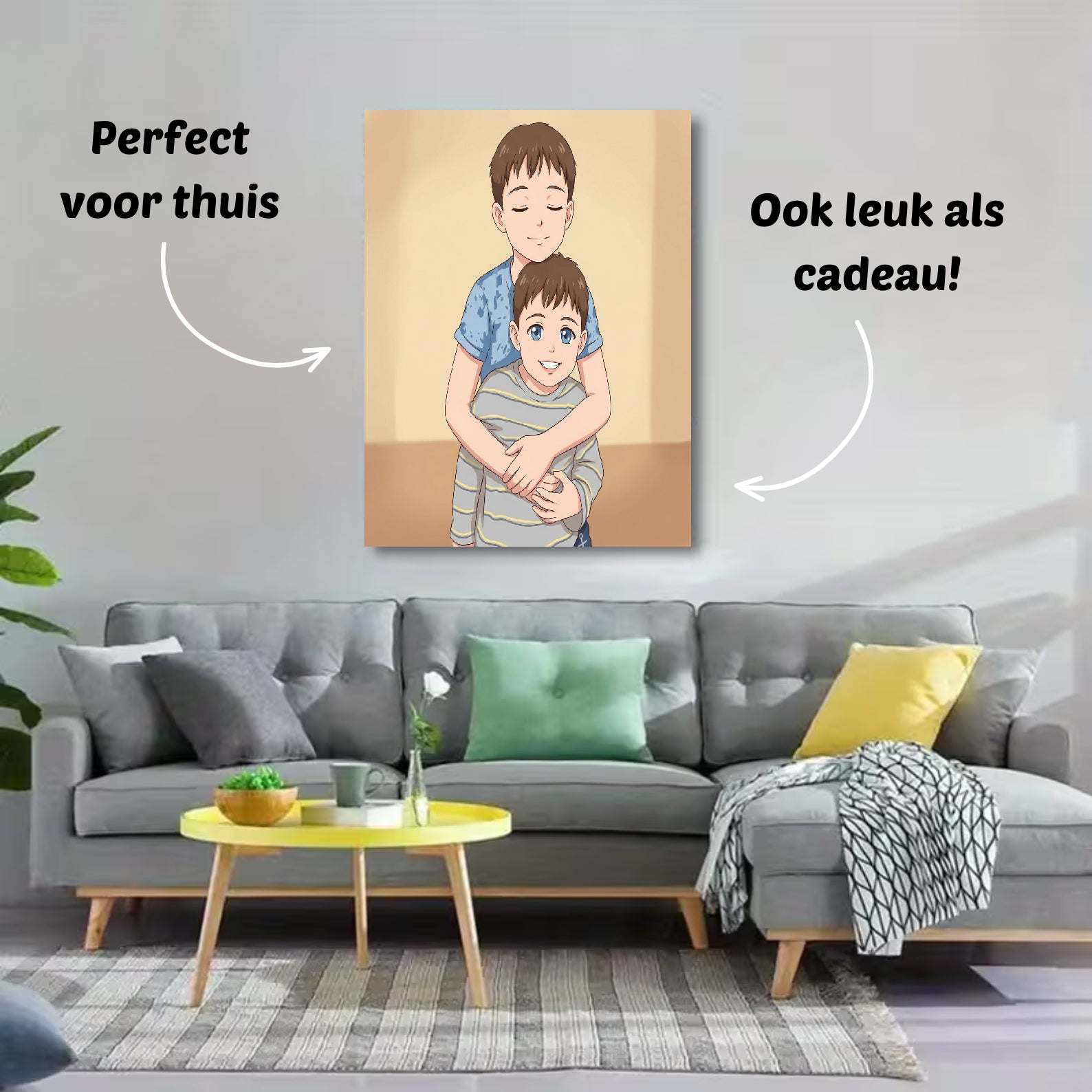 Onze foto’s op canvas zijn verkrijgbaar in verschillende formaten: 30×40 cm, 40×60 cm, 60×90 cm en 80×120 cm. Zo vind je altijd het formaat dat perfect bij jouw ruimte past — van een subtiel accent tot een opvallend groot cartoonportret aan de muur.