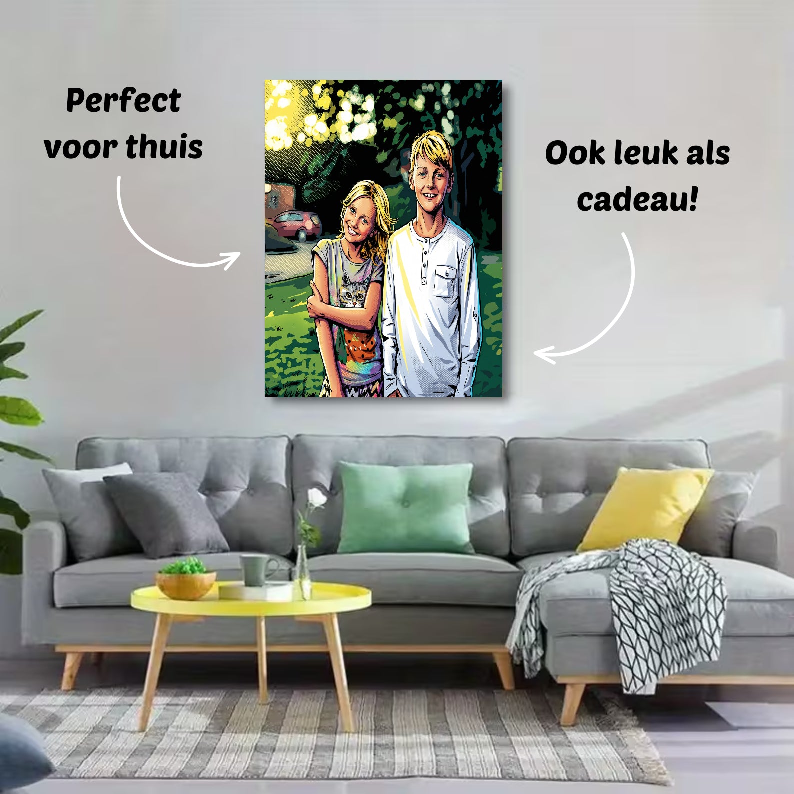 Onze foto’s op canvas zijn verkrijgbaar in verschillende formaten: 30×40 cm, 40×60 cm, 60×90 cm en 80×120 cm. Zo vind je altijd het formaat dat perfect bij jouw ruimte past — van een subtiel accent tot een opvallend groot cartoonportret aan de muur.