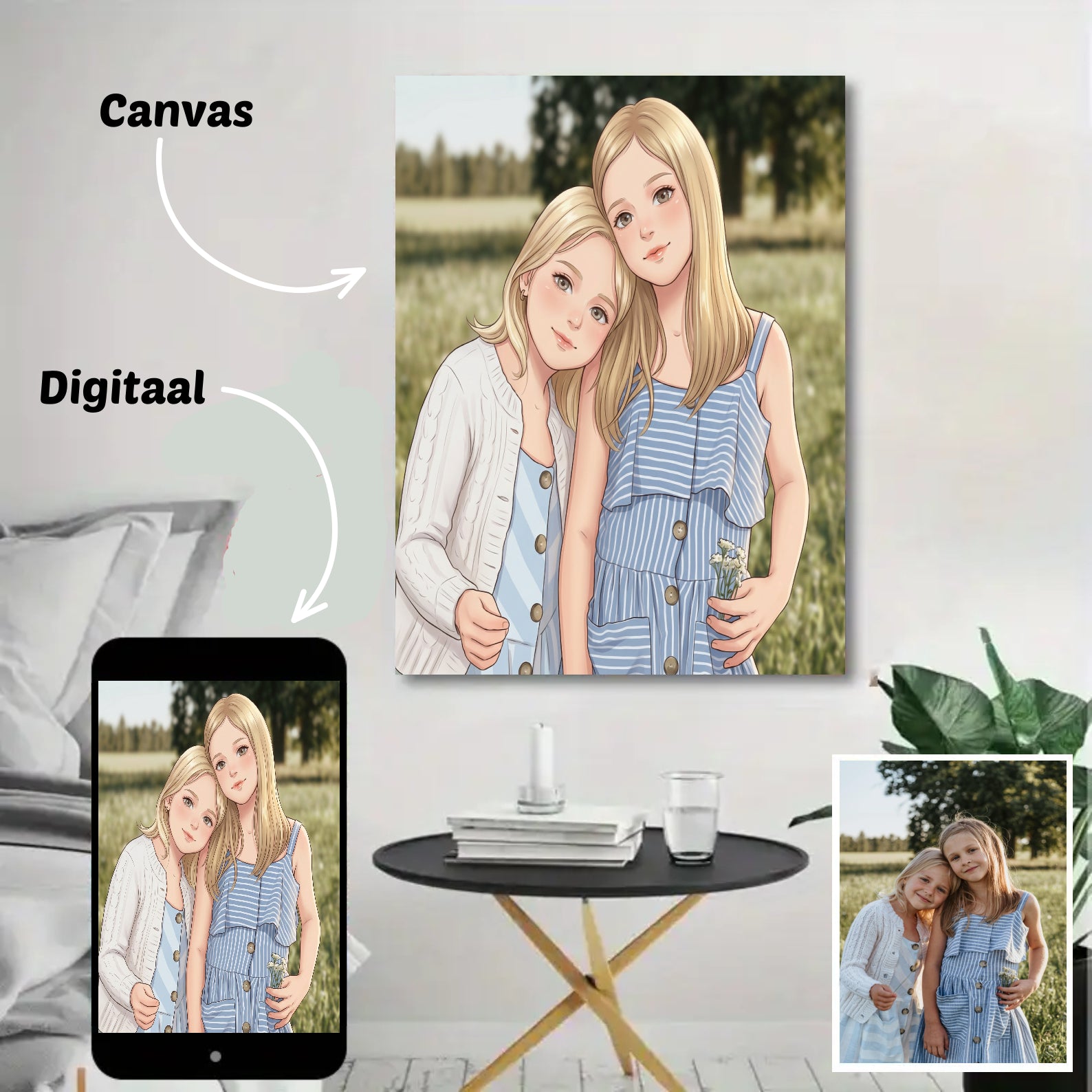 Canvas: ontvang je portret geprint op canvas, inclusief houten frame — direct klaar om op te hangen.