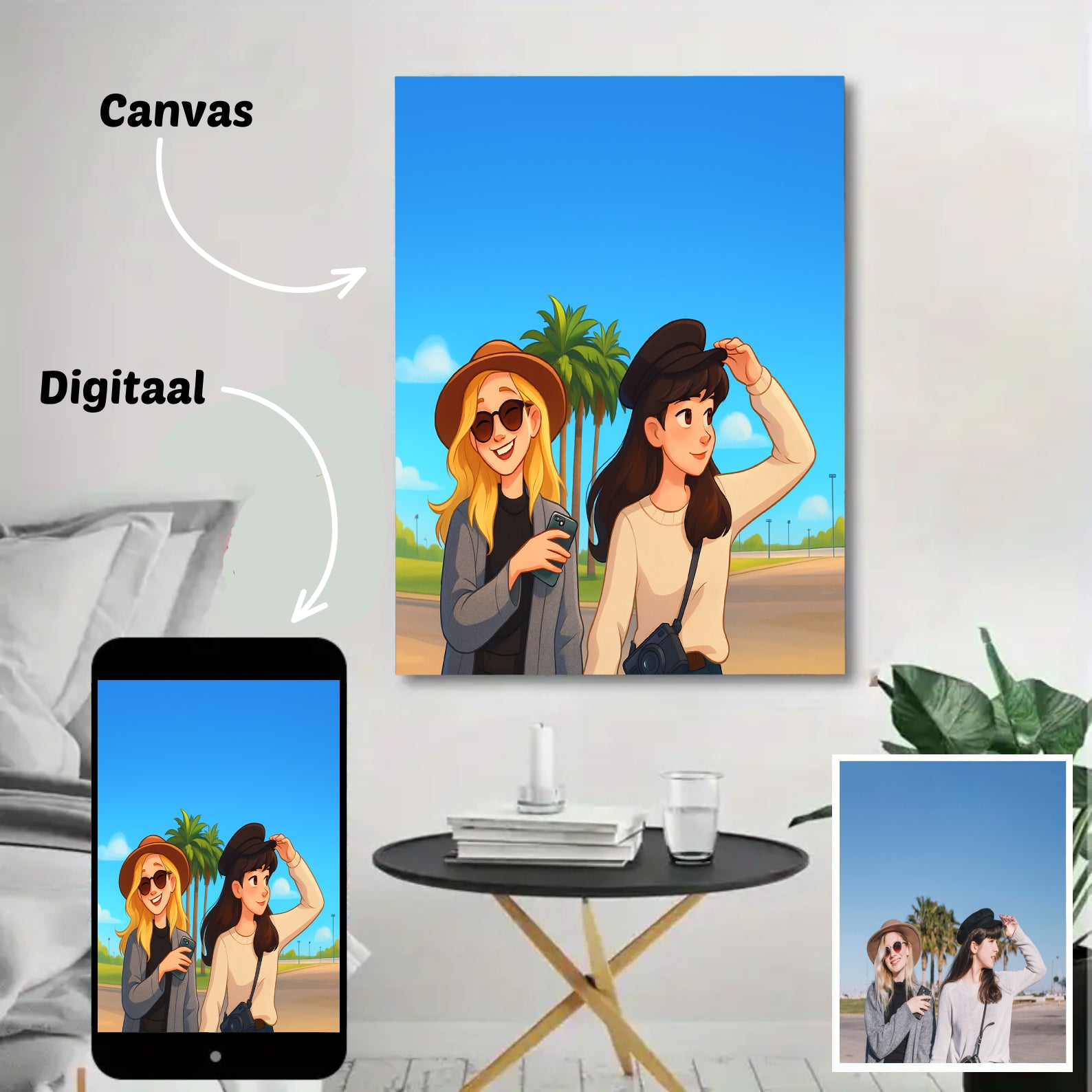 Onze foto’s op canvas zijn verkrijgbaar in verschillende formaten: 30×40 cm, 40×60 cm, 60×90 cm en 80×120 cm. Zo vind je altijd het formaat dat perfect bij jouw ruimte past — van een subtiel accent tot een opvallend groot cartoonportret aan de muur.