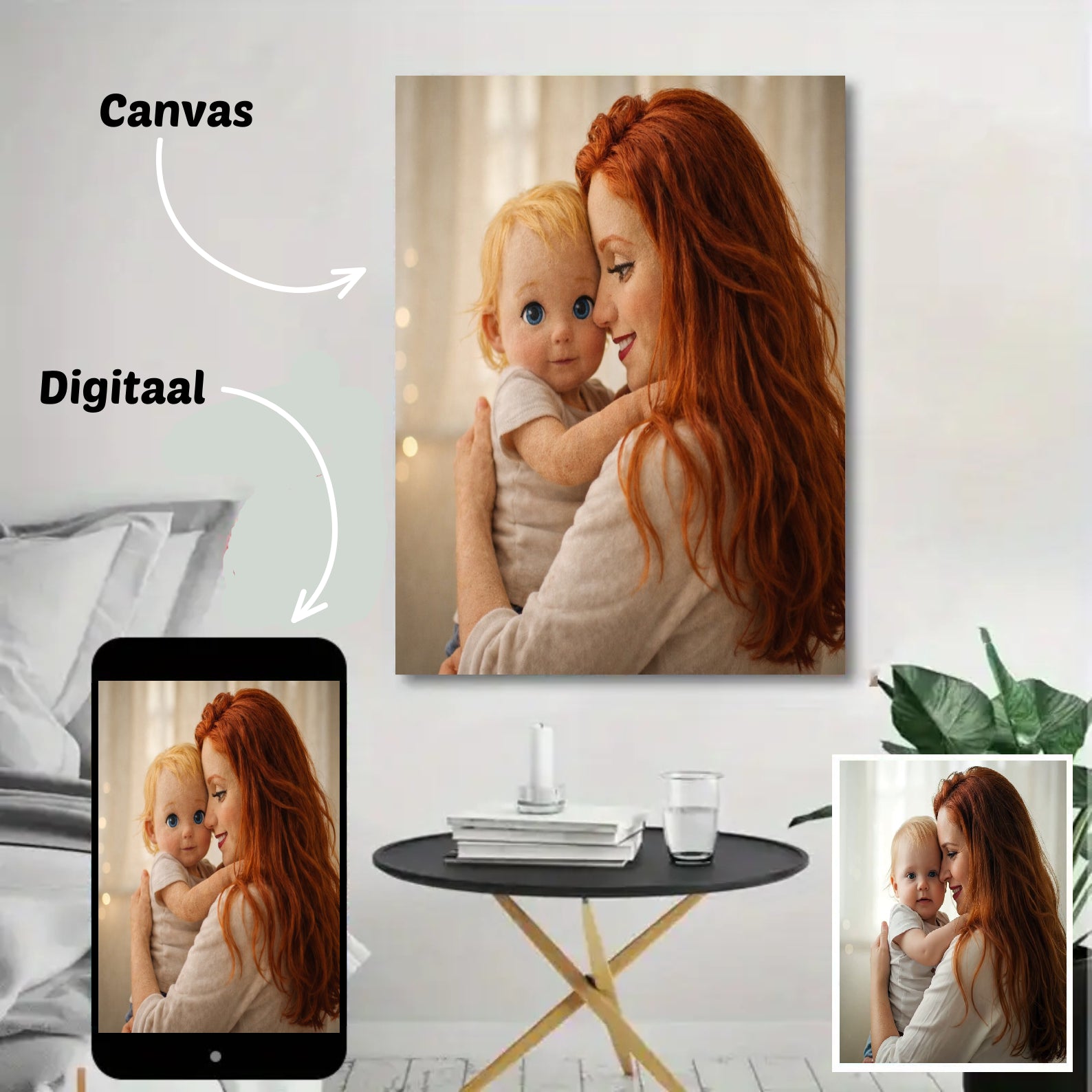 Canvas: ontvang je portret geprint op canvas, inclusief houten frame — direct klaar om op te hangen.